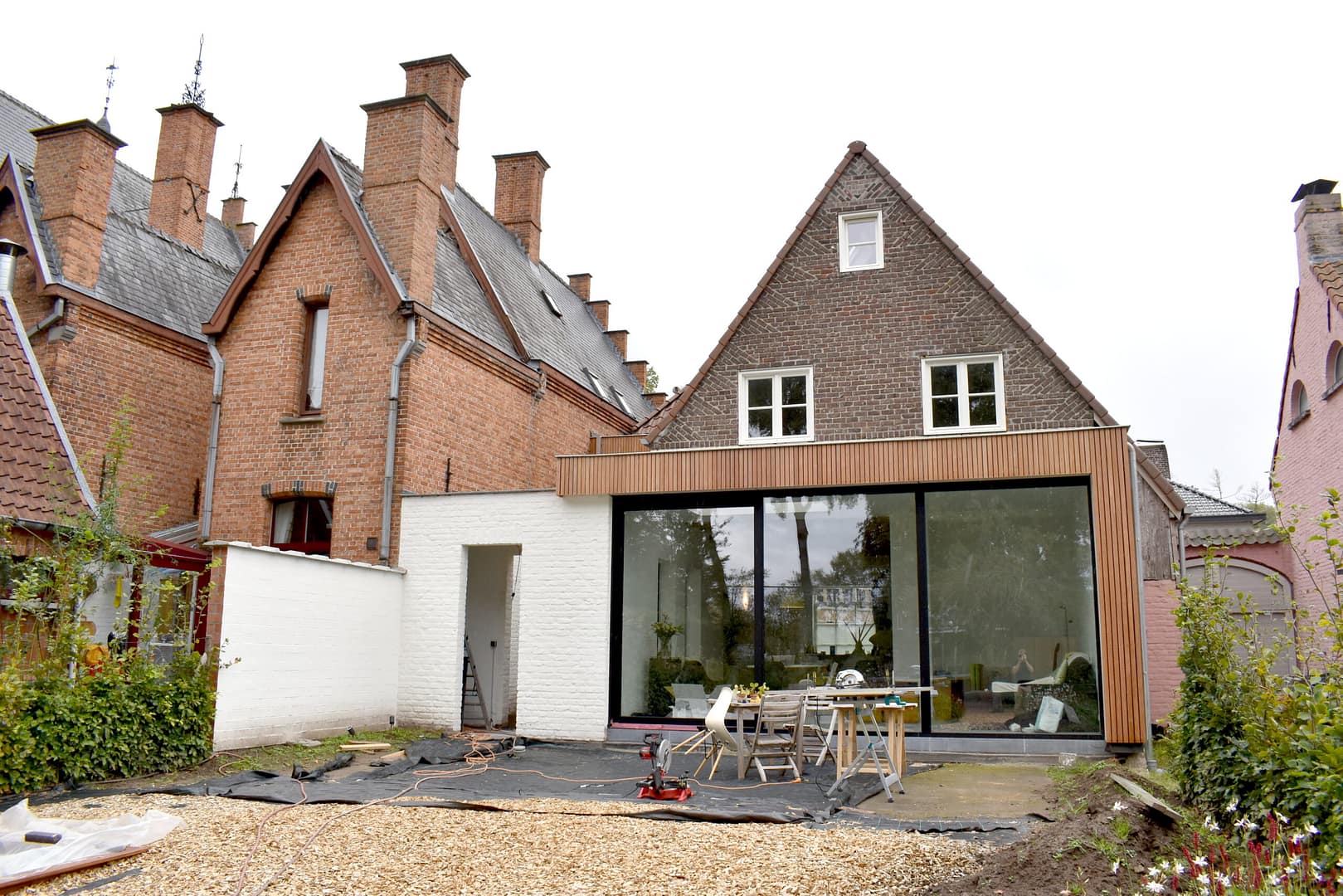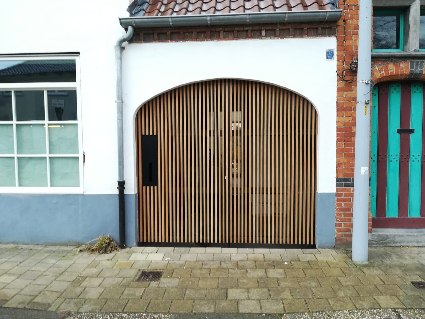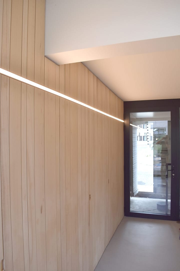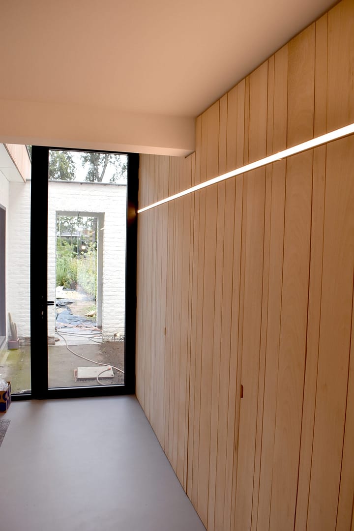 Een beglaasde voordeur biedt via het nieuwe sas een nieuwe toegang tot de woning, en geeft uit op de bestaande doorgang naar achteren. Een nieuwe kastenwand, afgewerkt met dezelfde materialen als de gevel, biedt daarbij plaats aan een vestiaire, toilet en zelfs de wasplaats. Met het openen van de kastdeuren ontstaat een praktische ruimte waar was & strijk kan worden gedaan, zonder de handige doorgang naar de tuin te moeten doorknippen…