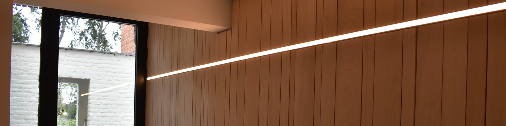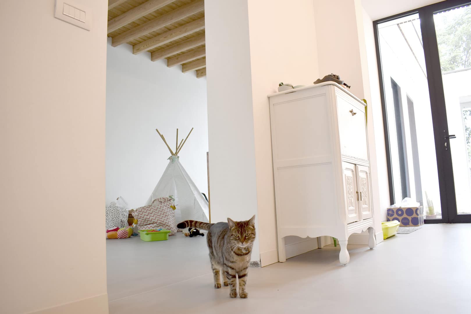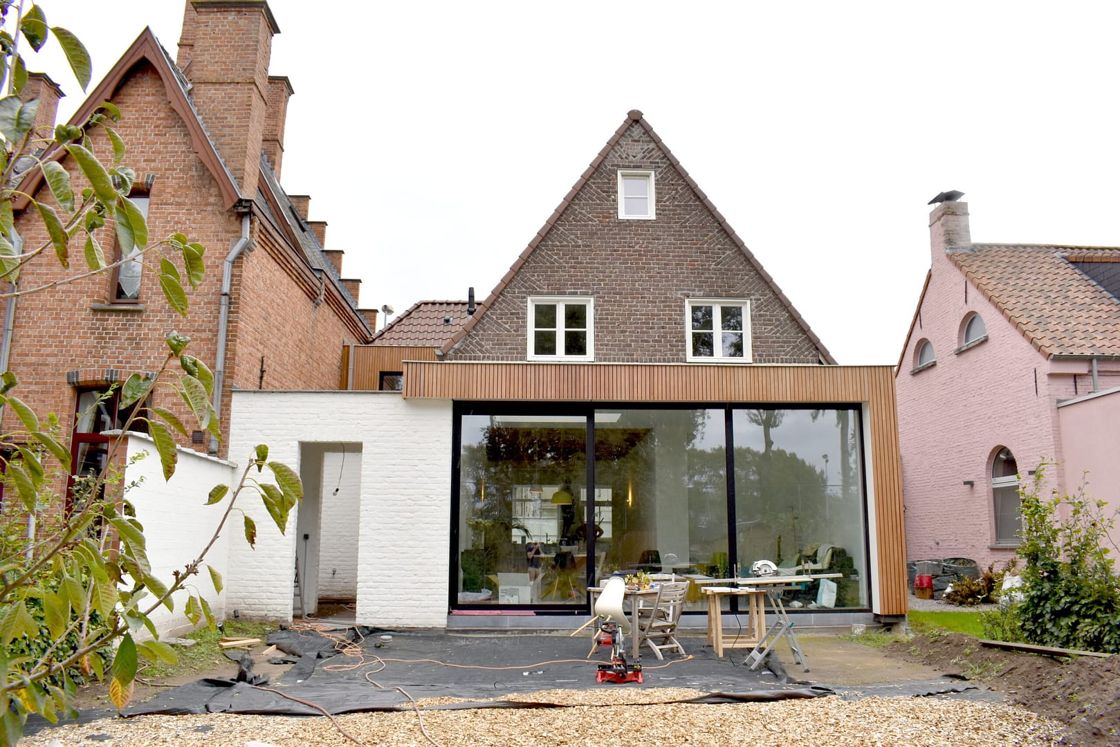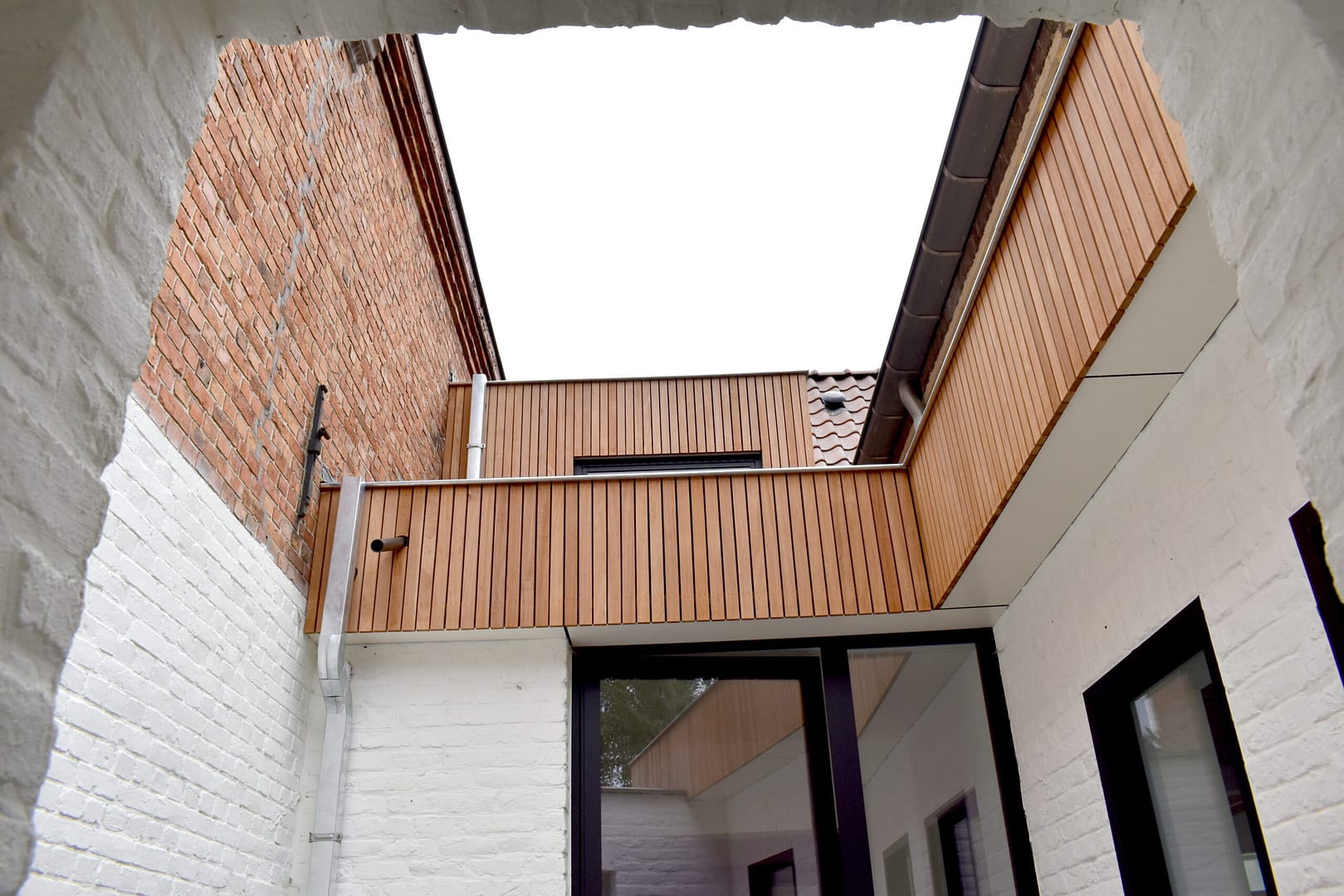 Een beglaasde voordeur biedt via het nieuwe sas een nieuwe toegang tot de woning, en geeft uit op de bestaande doorgang naar achteren. Een nieuwe kastenwand, afgewerkt met dezelfde materialen als de gevel, biedt daarbij plaats aan een vestiaire, toilet en zelfs de wasplaats. Met het openen van de kastdeuren ontstaat een praktische ruimte waar was & strijk kan worden gedaan, zonder de handige doorgang naar de tuin te moeten doorknippen…