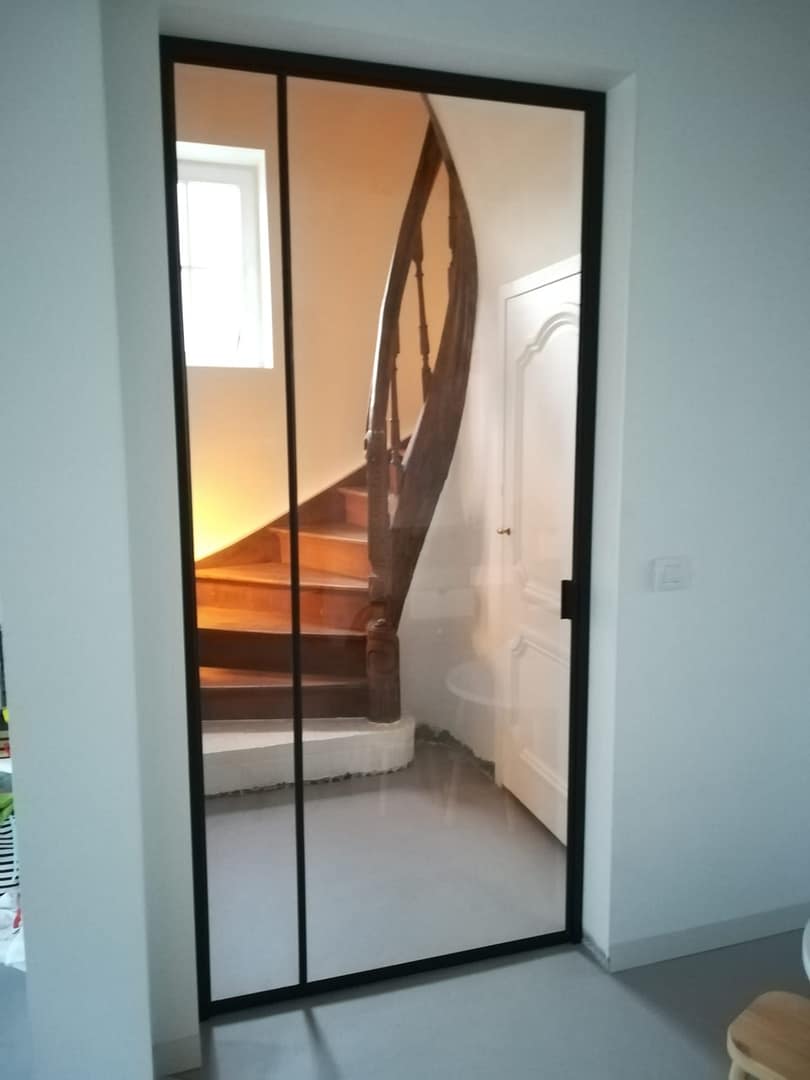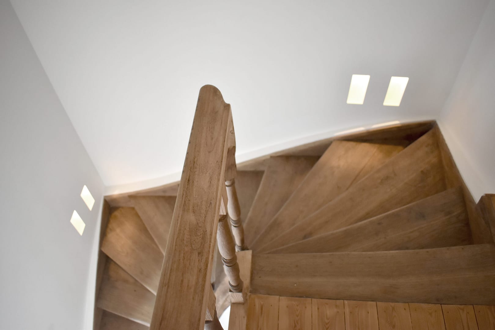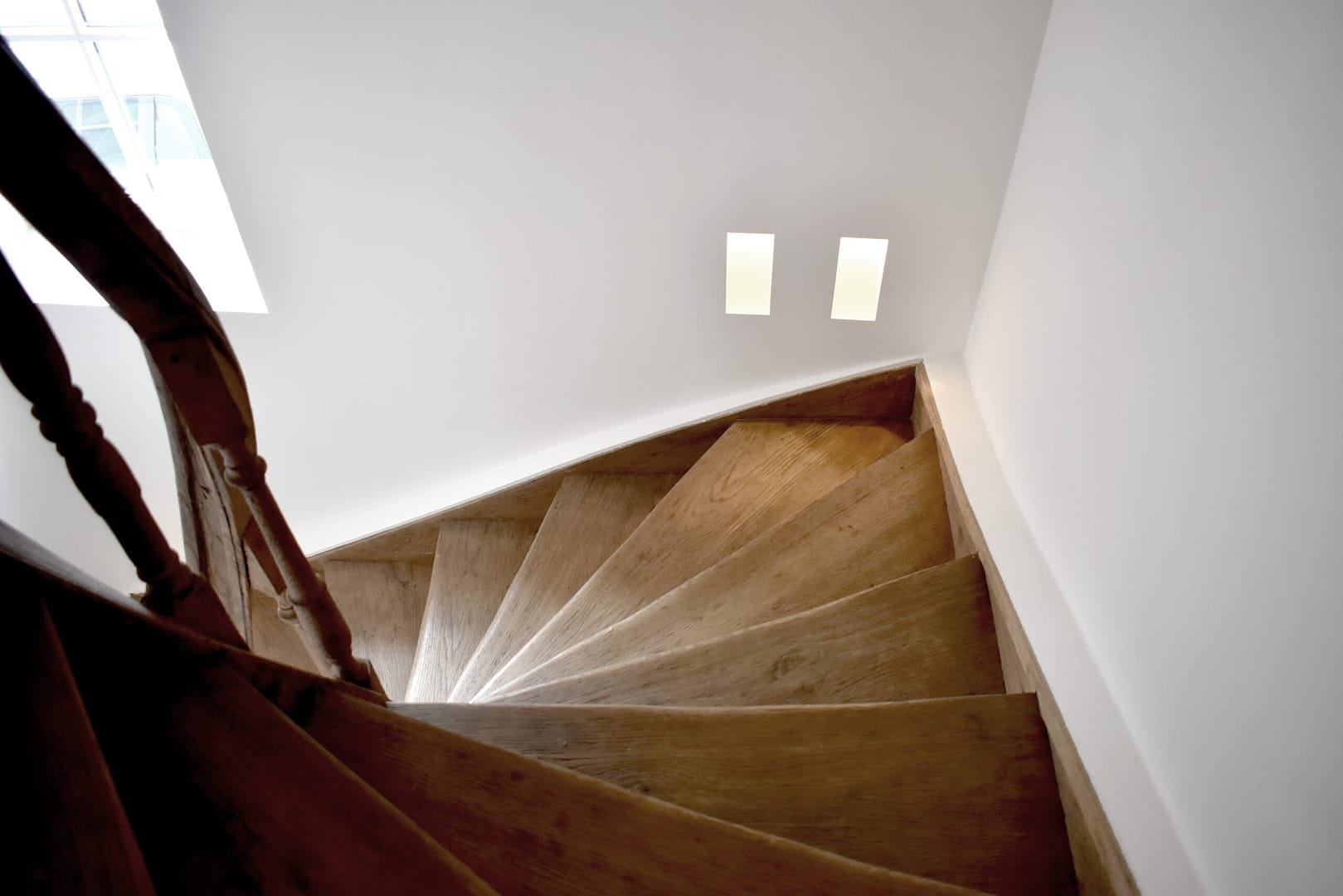 Een binnenraam zorgt voor het afschermen van deze gezellige leefruimte ten opzichte van de traphal, maar biedt nog steeds het zicht op de prachtige houten draaitrap van de traphal.