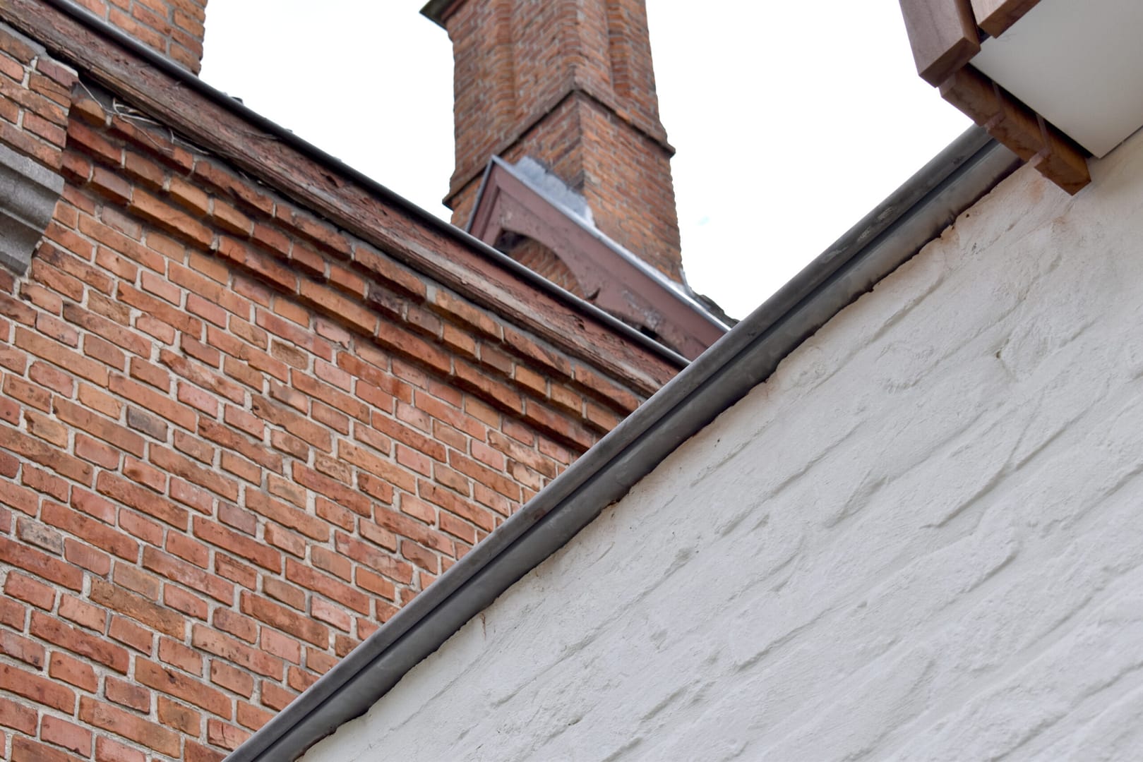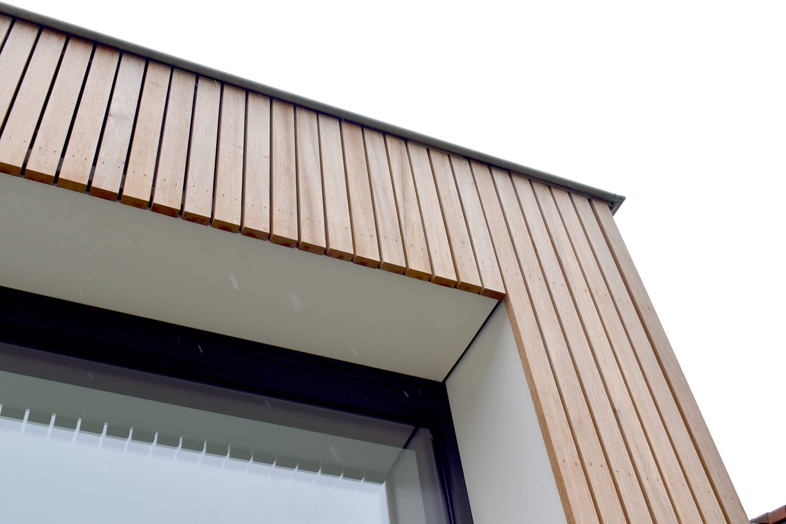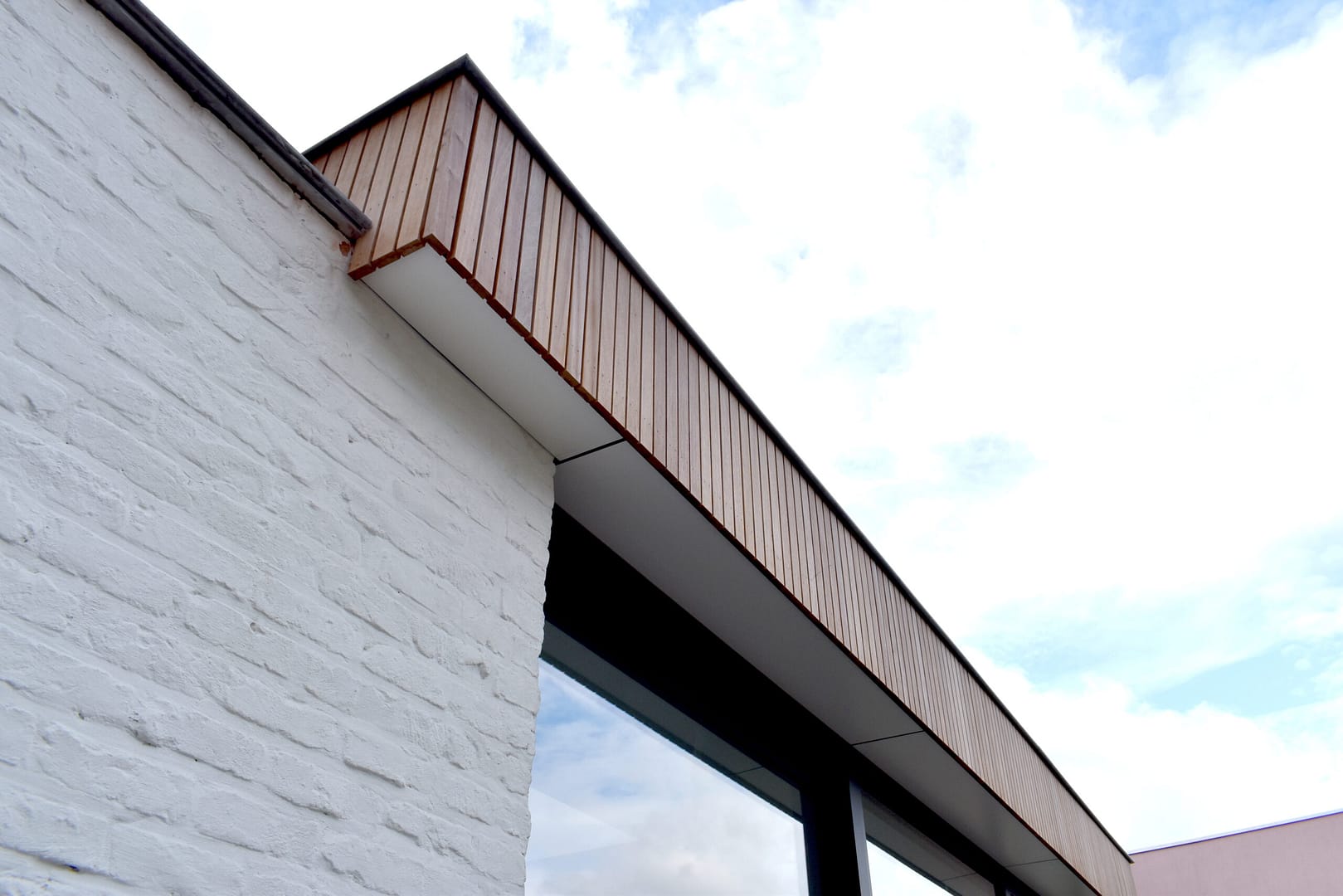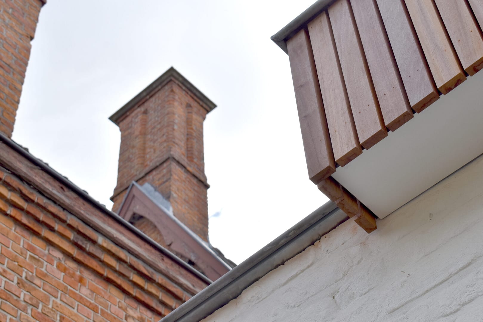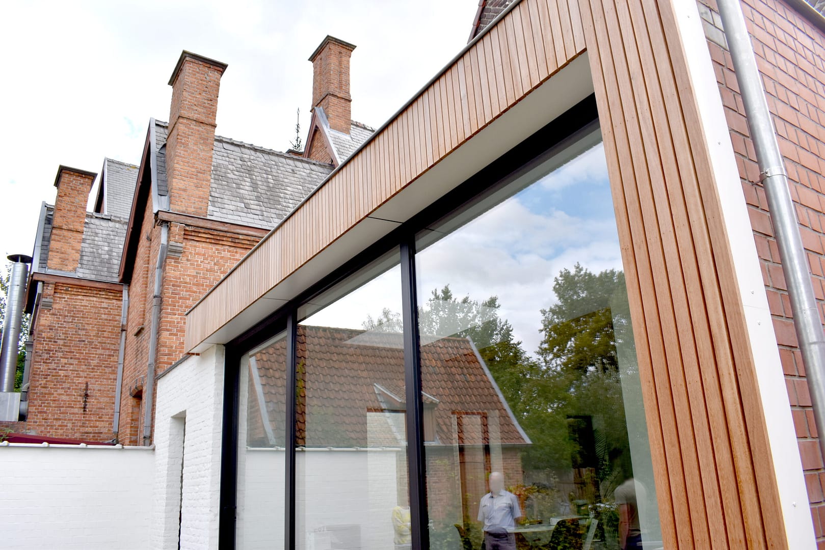 Als contrast met de bestaande, historische gevel in metselwerk, wordt een nieuw volume opgetrokken aan de tuinzijde van de woning. Deze krijgt een groot raam en een ruime koepel, zodat het licht vlot binnenvalt in de leefruimtes. Het latwerk van de gevelbekleding wordt doorgetrokken over de verschillende uitbouwen, en geeft ook vorm aan de dakuitbouw van de badkamer. Daarnaast wordt het hout binnen herhaald in de kastenwand langsheen de inkomzone.