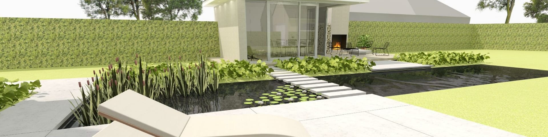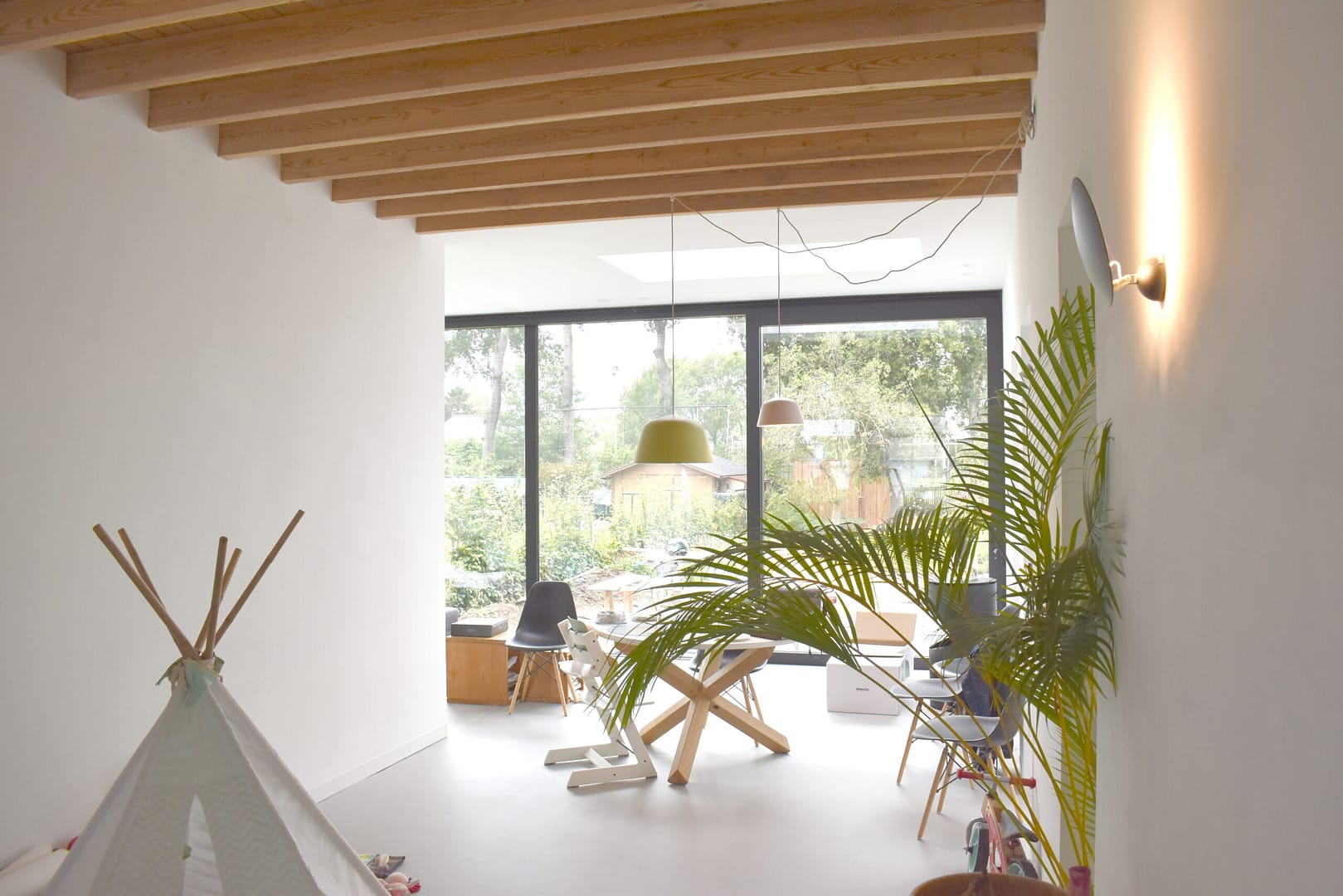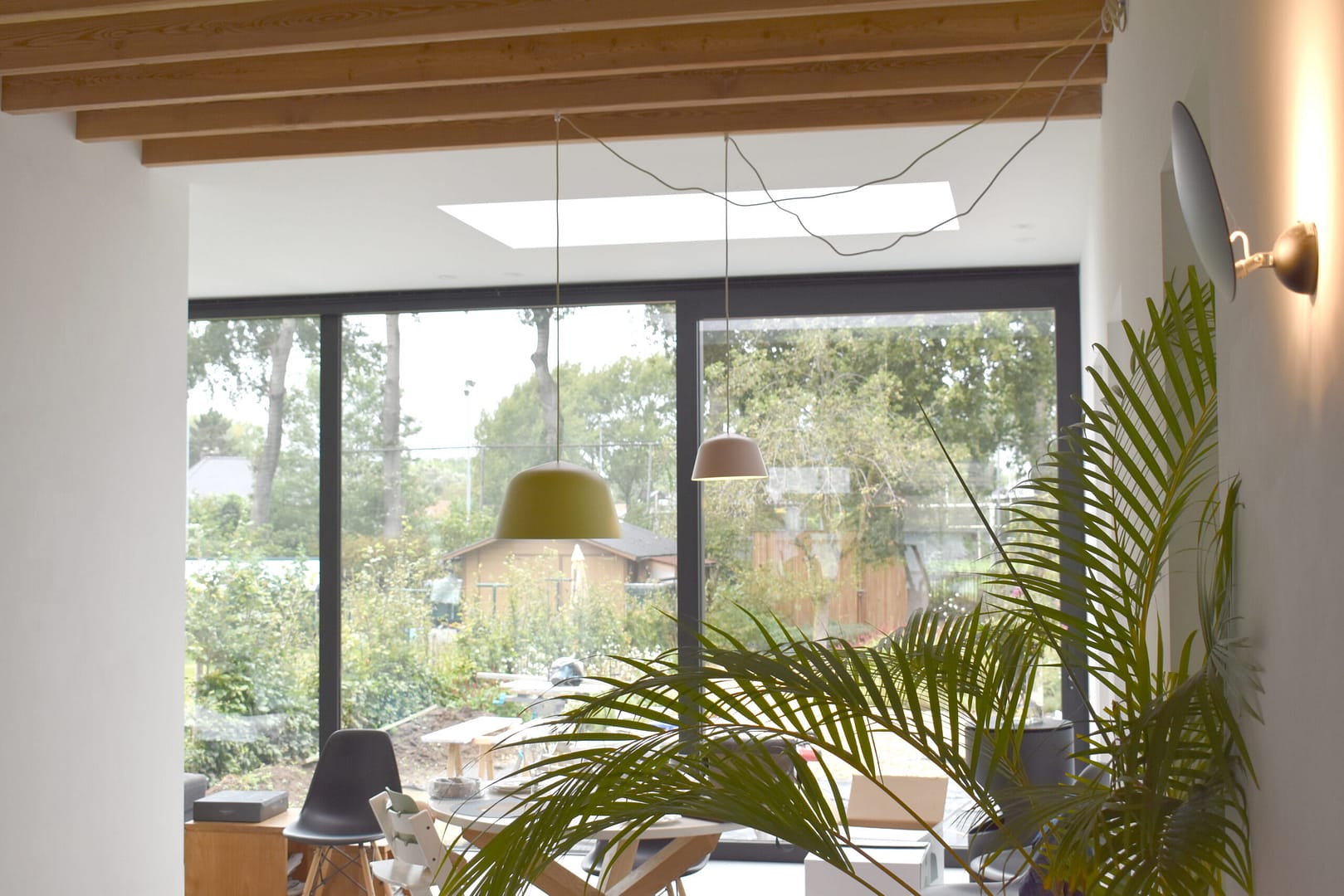 Een groot schuifraam zorgt voor een sterke verbinding met het terras en de diepe achtertuin.