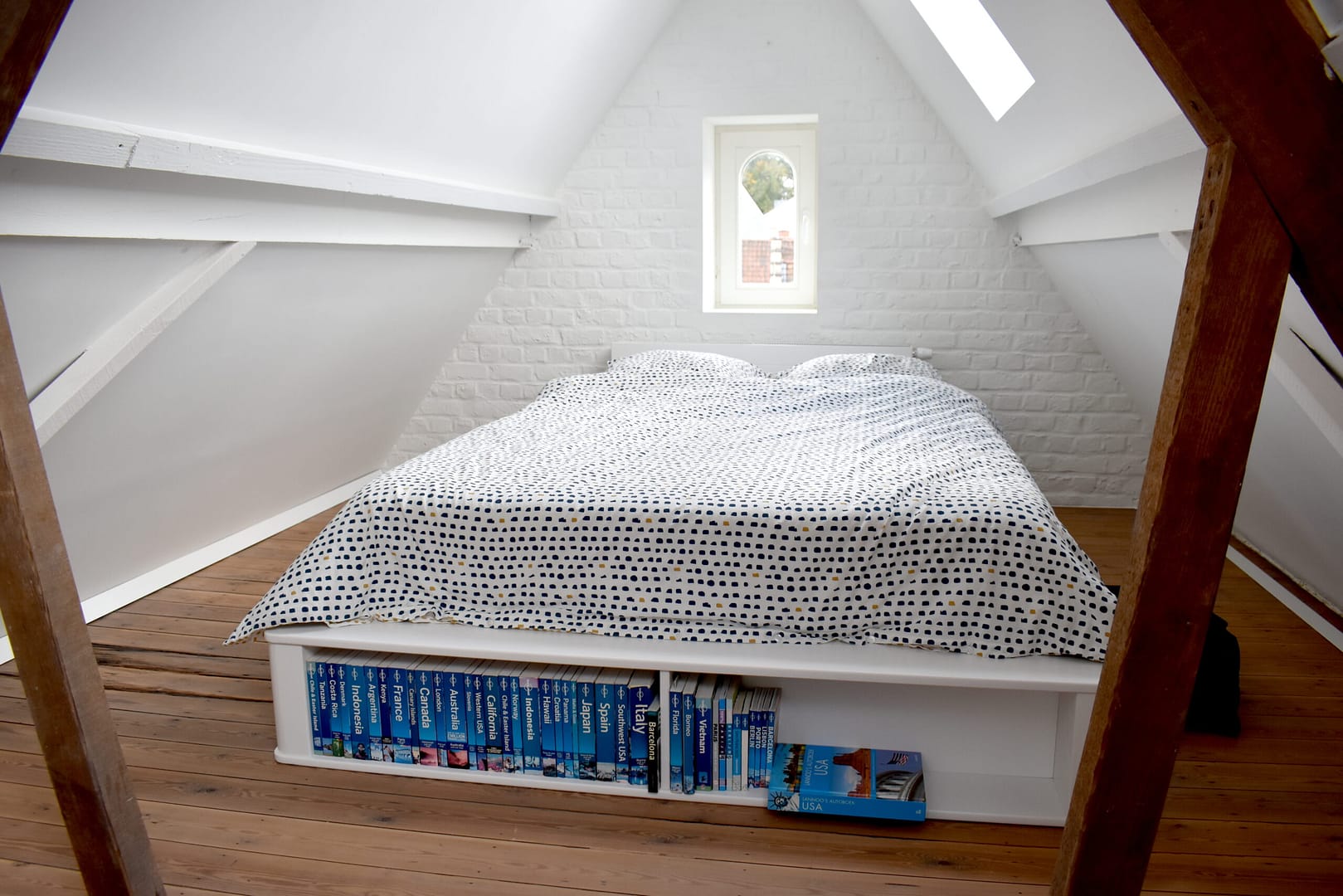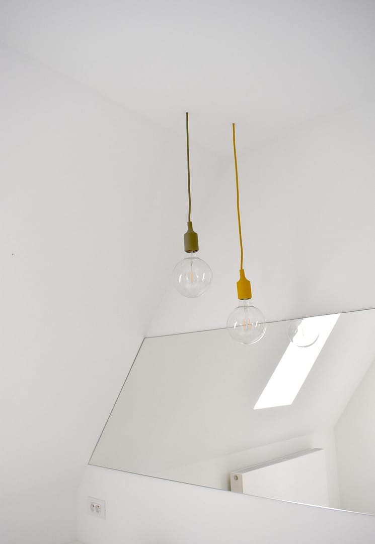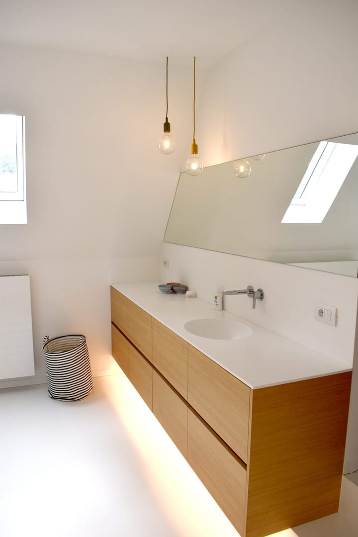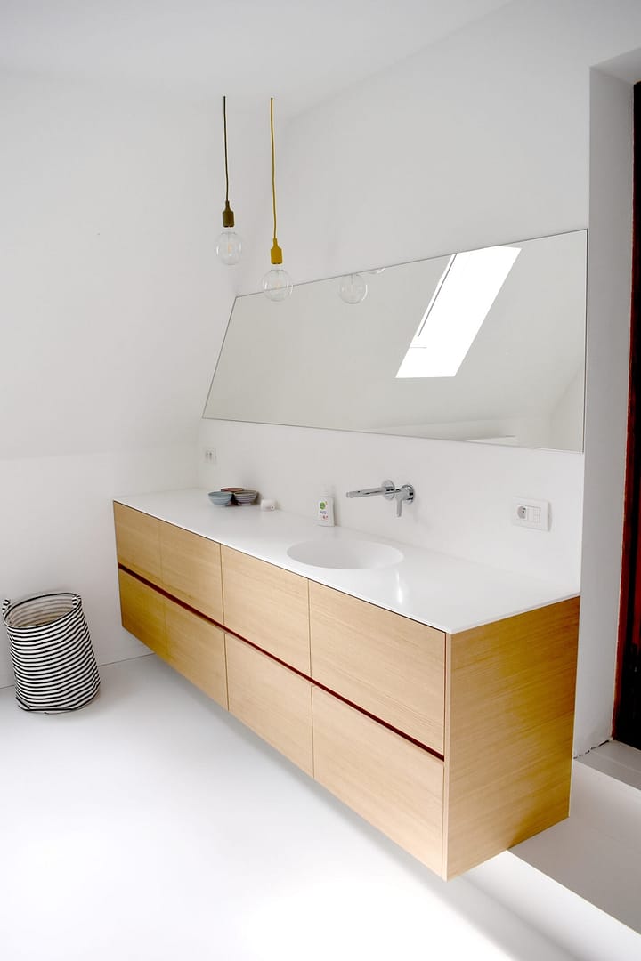 Boven wordt een nieuwe badkamer ingericht, in een bestaande bergruimte die enkele tredes lager ligt dan de rest van de verdiepingsvloer. Ontworpen in het badkamermeubel werkt een dubbele trede het niveauverschil weg. Een watervaste vloerbekleding en ingewerkte glazen wand creëert daarnaast plaats voor een ruime inloopdouche, aan de rugzijde van het toilet. Een lange spiegel creëert extra diepte in deze ruimte…