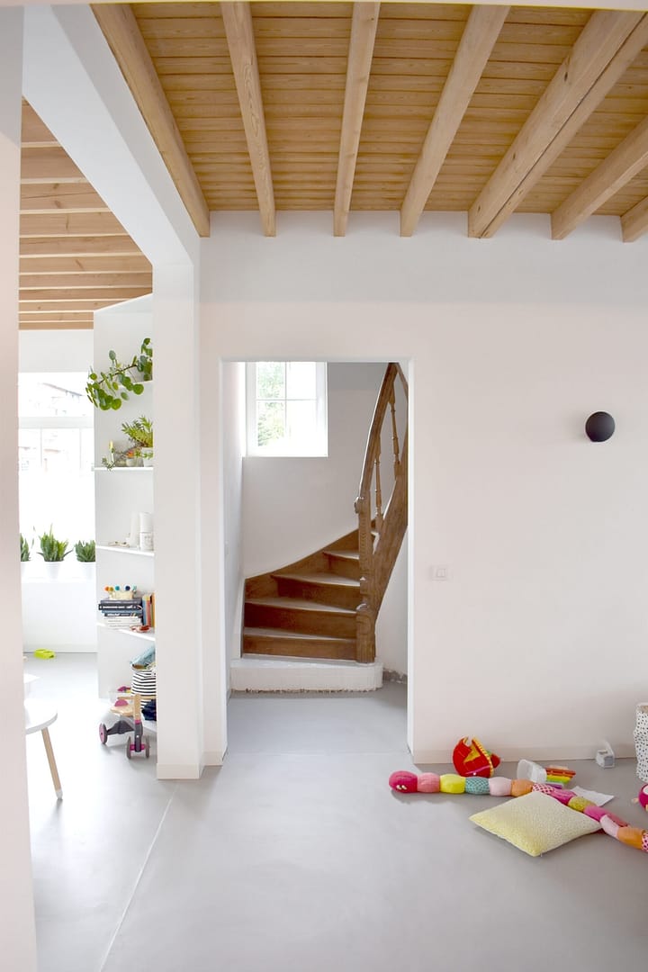 De bestaande leefruimte vooraan wordt opengewerkt naar de leefruimtes achteraan, zodat één grote, open woning wordt gecreëerd. Een nieuw vloerpakket wordt voorzien, en na het isoleren van de vloerplaat wordt een strakke, lichtgrijze gietvloer voorzien. De bestaande houten roostering en planken van de verdiepingsvloer blijven behouden en worden gerestaureerd, voor een authentiek karakter van de woning.