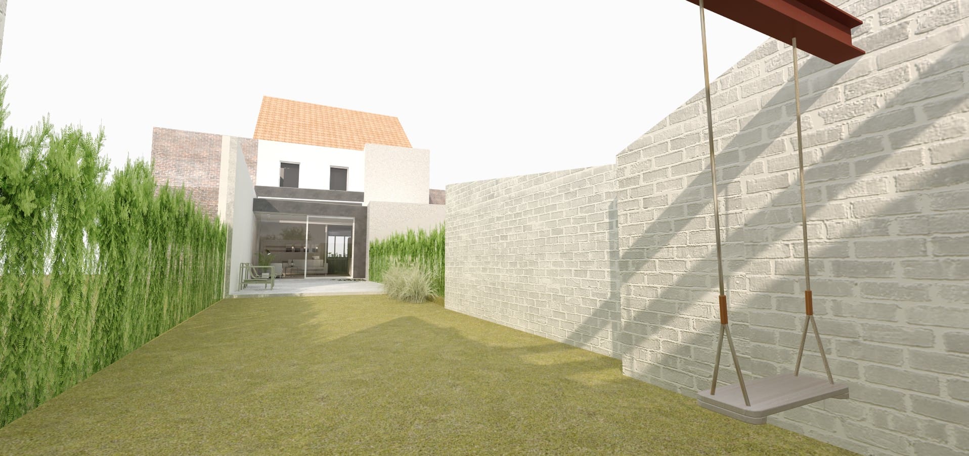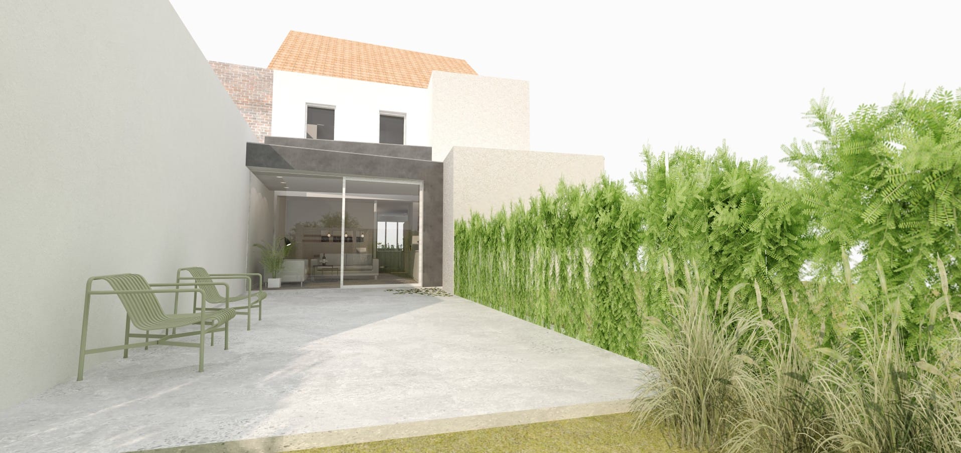 Om terug contact te krijgen met de mooie, diepe tuin werd besloten de ganse achteruitbouw af te breken. Deze maakt plaats voor een nieuwe, perceelsbrede uitbouw, die de nodige ruimte biedt aan een gloednieuwe open keuken. Tussen de tuin en de keuken bevindt zich in dezelfde ruimte de eetplaats, die zich vlak aan het grote raam van de achtergevel bevindt.
