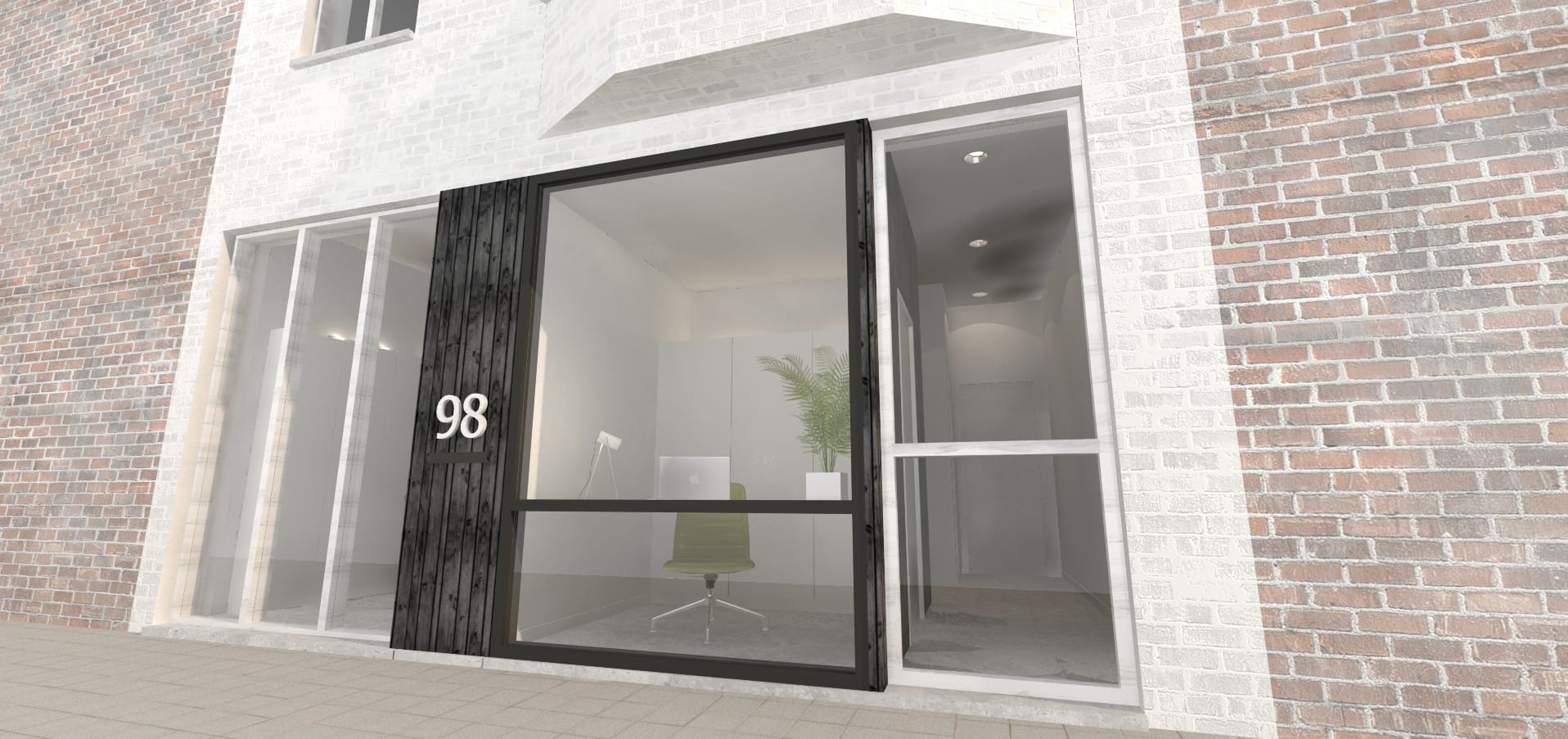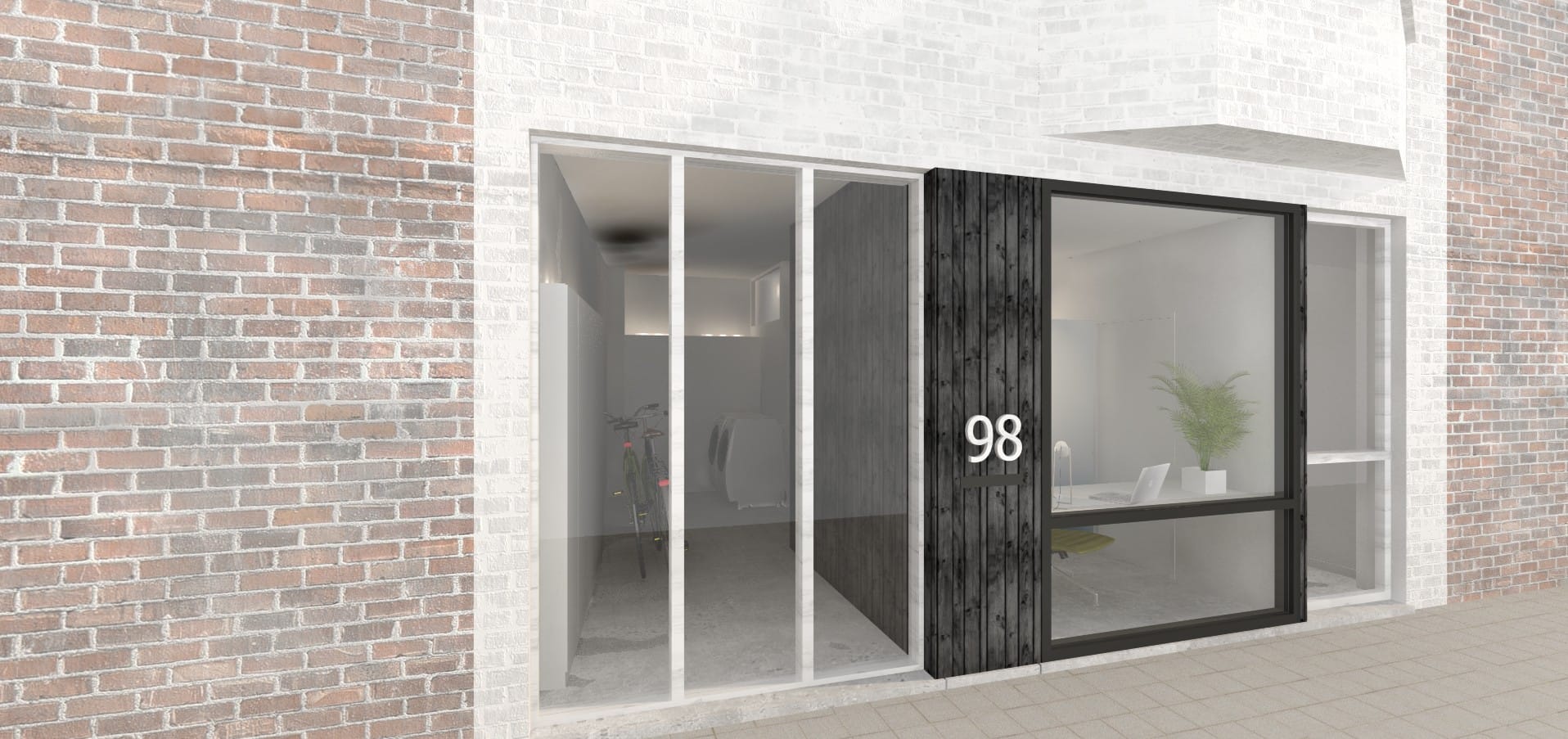 Ook de voorgevel wordt met de verbouwingswerken aangepakt. Het parementsmetselwerk wordt weggenomen, en maakt plaats voor een nieuwe bekleding met houten latten op isolatie. Nieuw buitenschrijnwerk wordt voorzien.