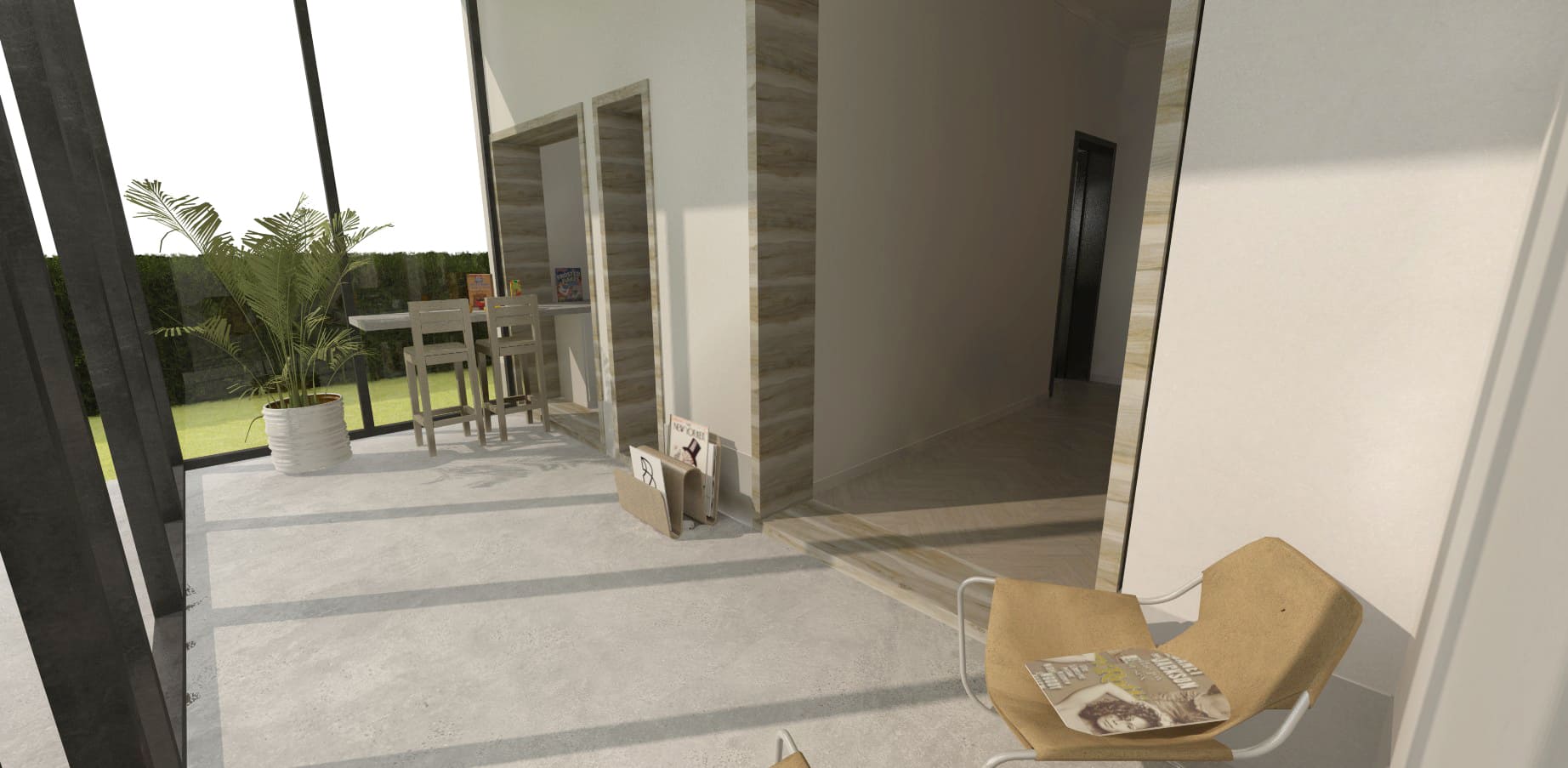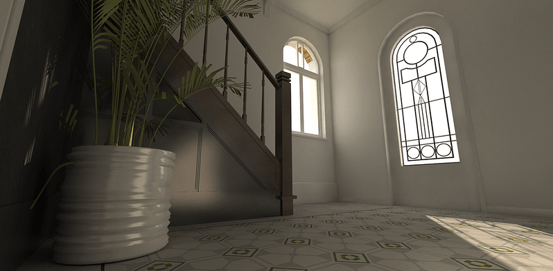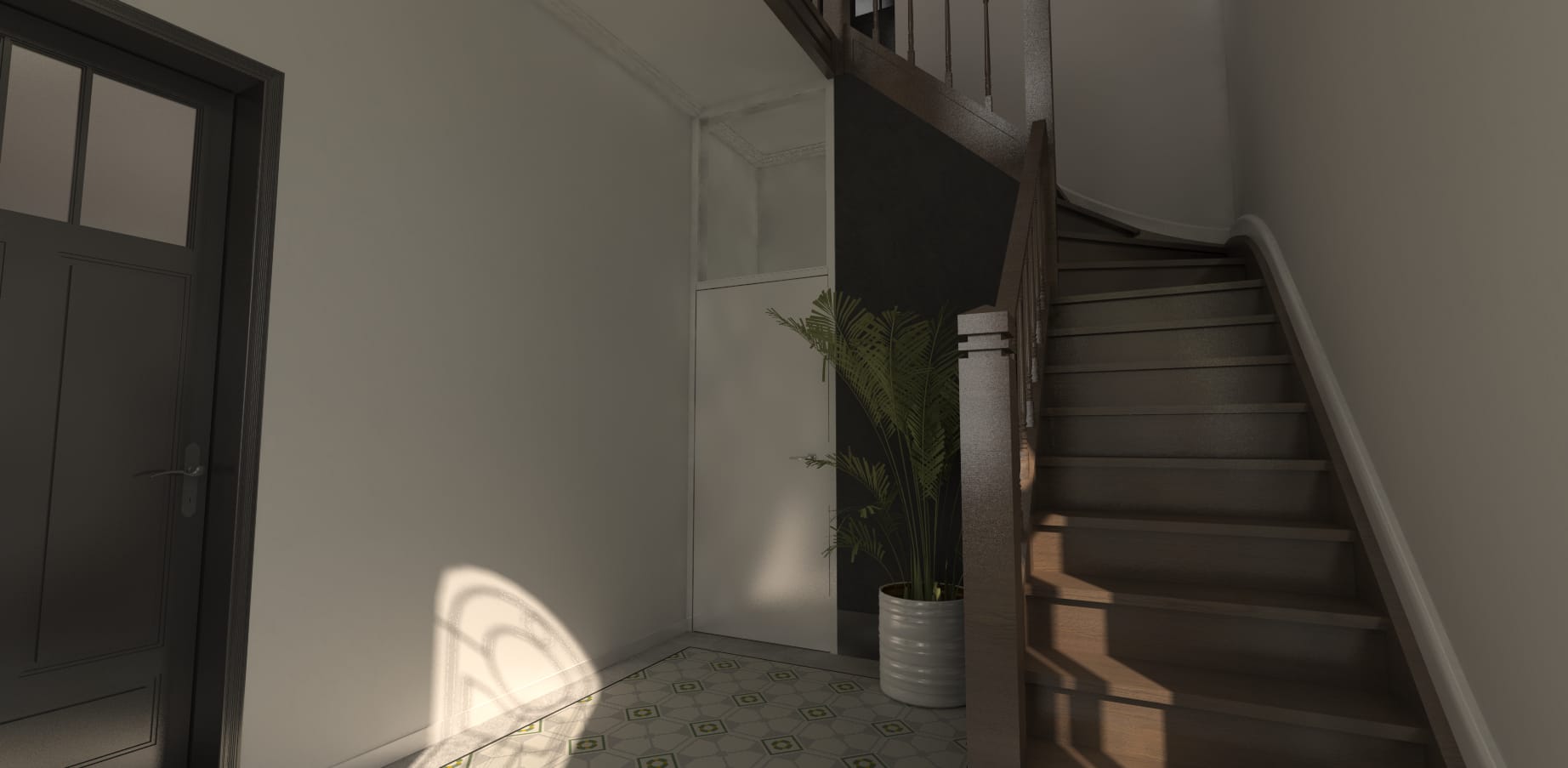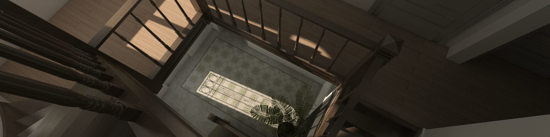 Op de gelijkvloers wordt gekozen voor een gepolierde betonnen vloerafwerking. Ter hoogte van de inkom & traphal, worden de bestaande tegels met motief gerecupereerd. Deze worden als een nieuw tapijt in de betonnen vloerbekleding ingewerkt, en vormen zo een link naar het verleden. De ruime traphal wordt volledig opgefrist, waardoor de trap opnieuw een statig element in de woning kan worden.