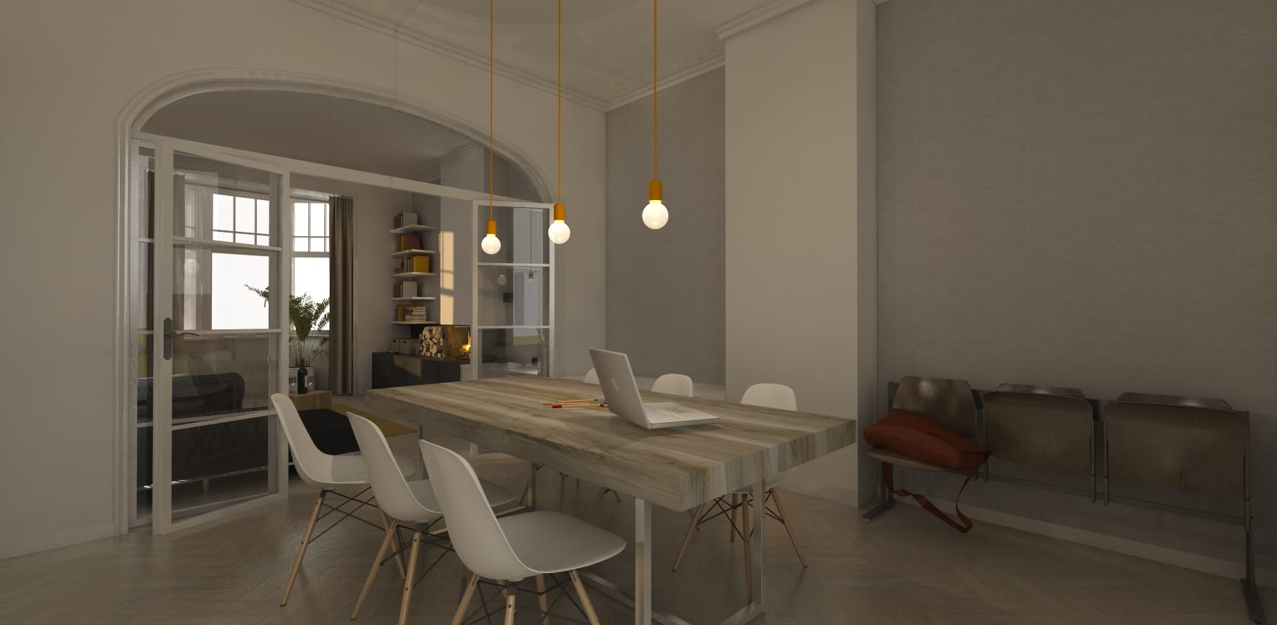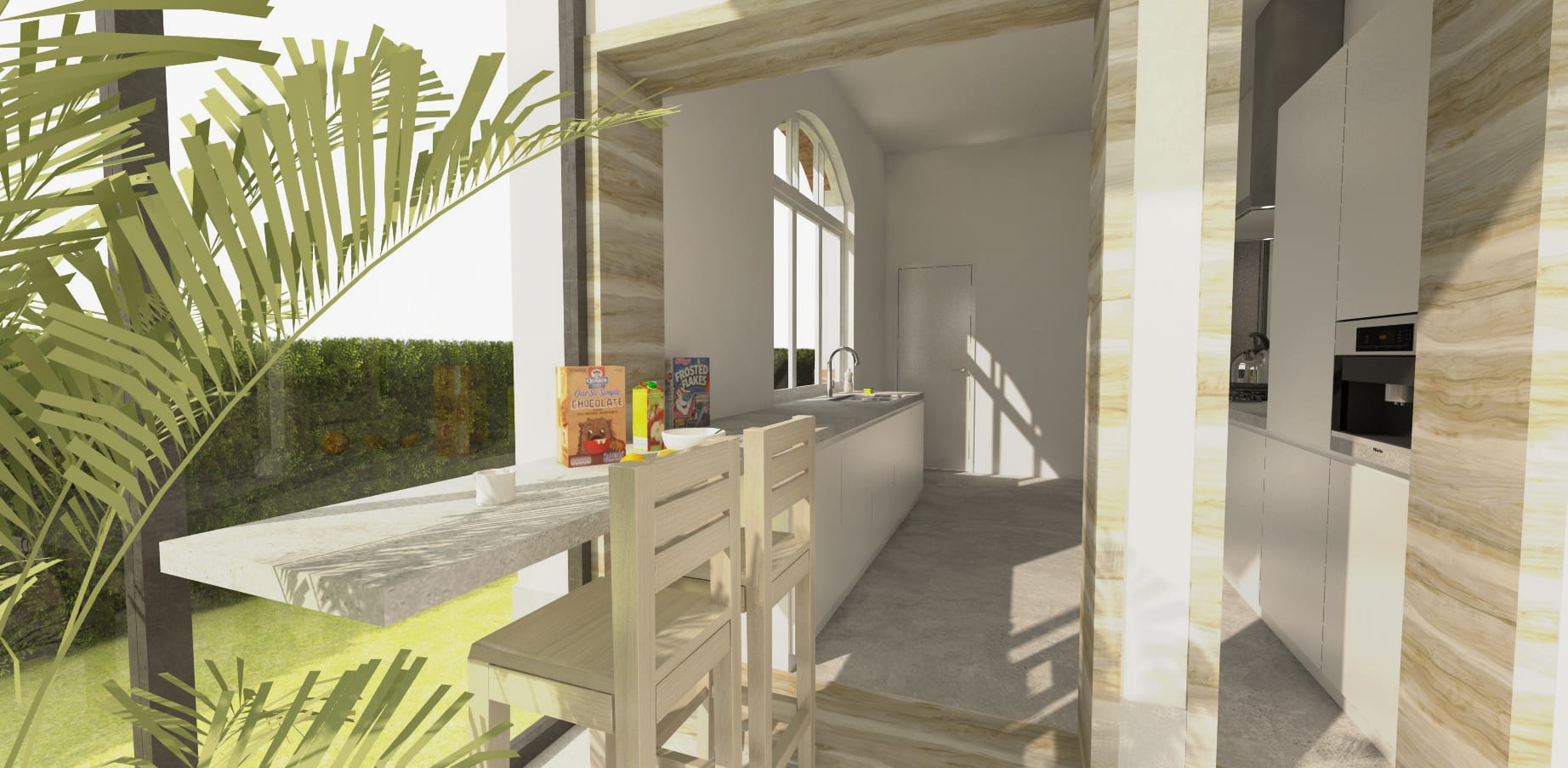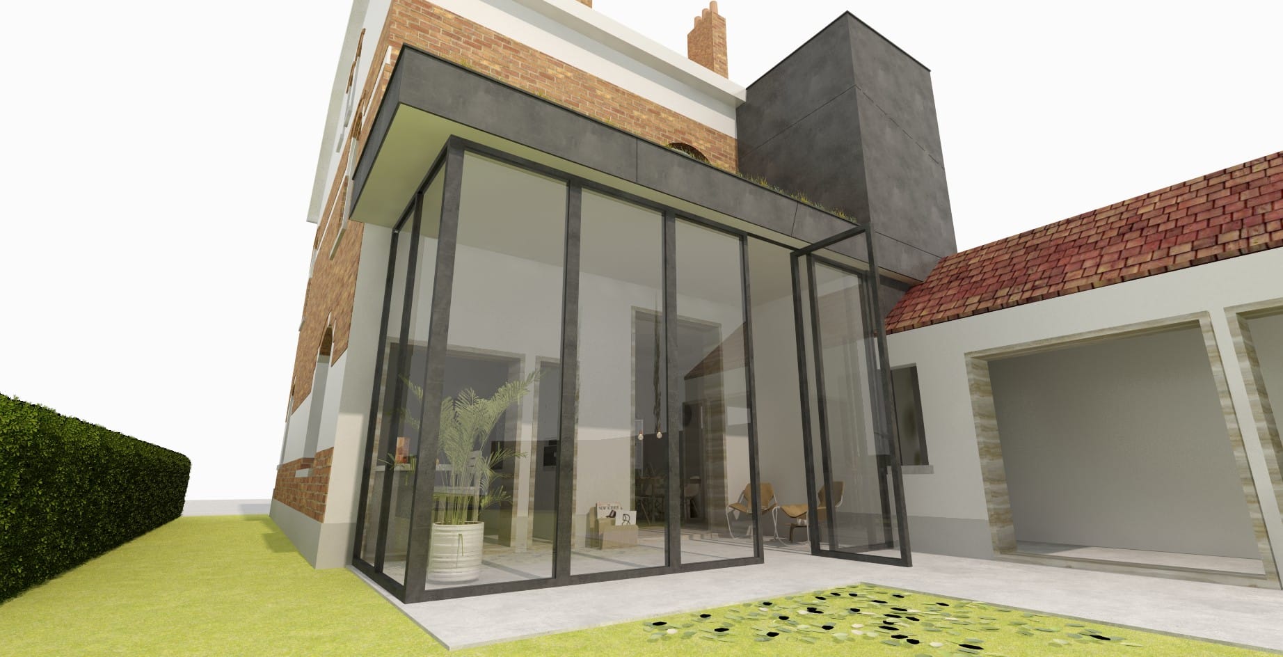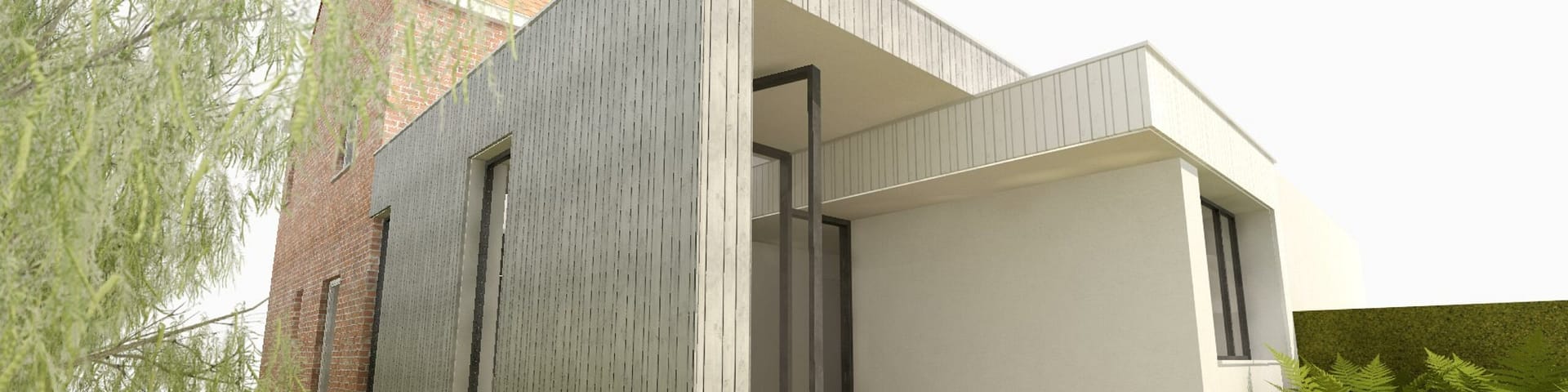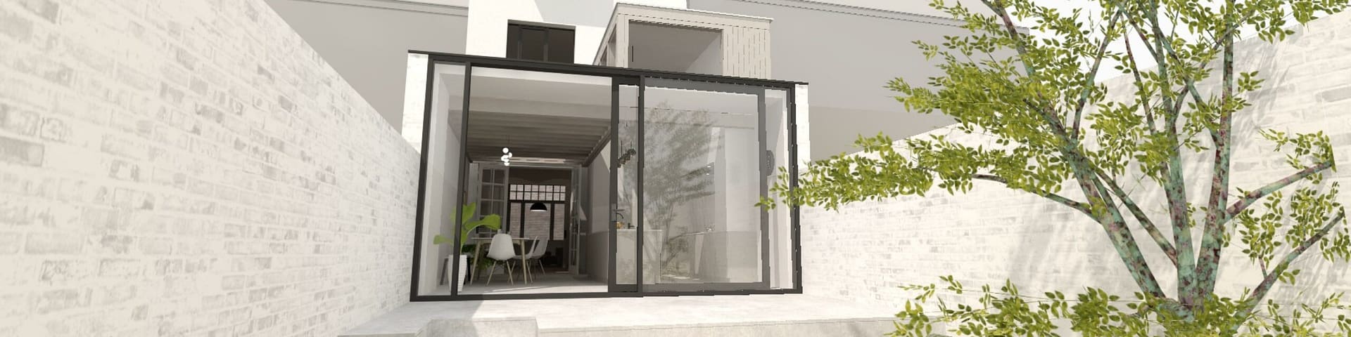 Om een optimaal contact met de tuin te behouden, en zoveel als mogelijks het natuurlijk daglicht tot diep in de woning binnen te brengen, werd gekozen voor een beglaasde achteruitbouw, met nóg hogere plafonds. Deze wordt als een nieuw onderdeel tegen de woning aan geplaatst, waarbij de authentieke gevels zoveel als mogelijk blijven bewaard. Met het vele glas en de speelse openingen in de bestaande gevels, wordt een evenwicht gecreëerd tussen oud & nieuw.