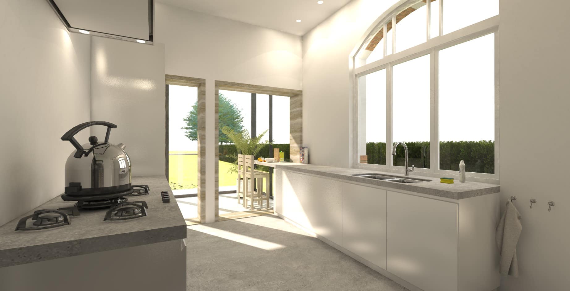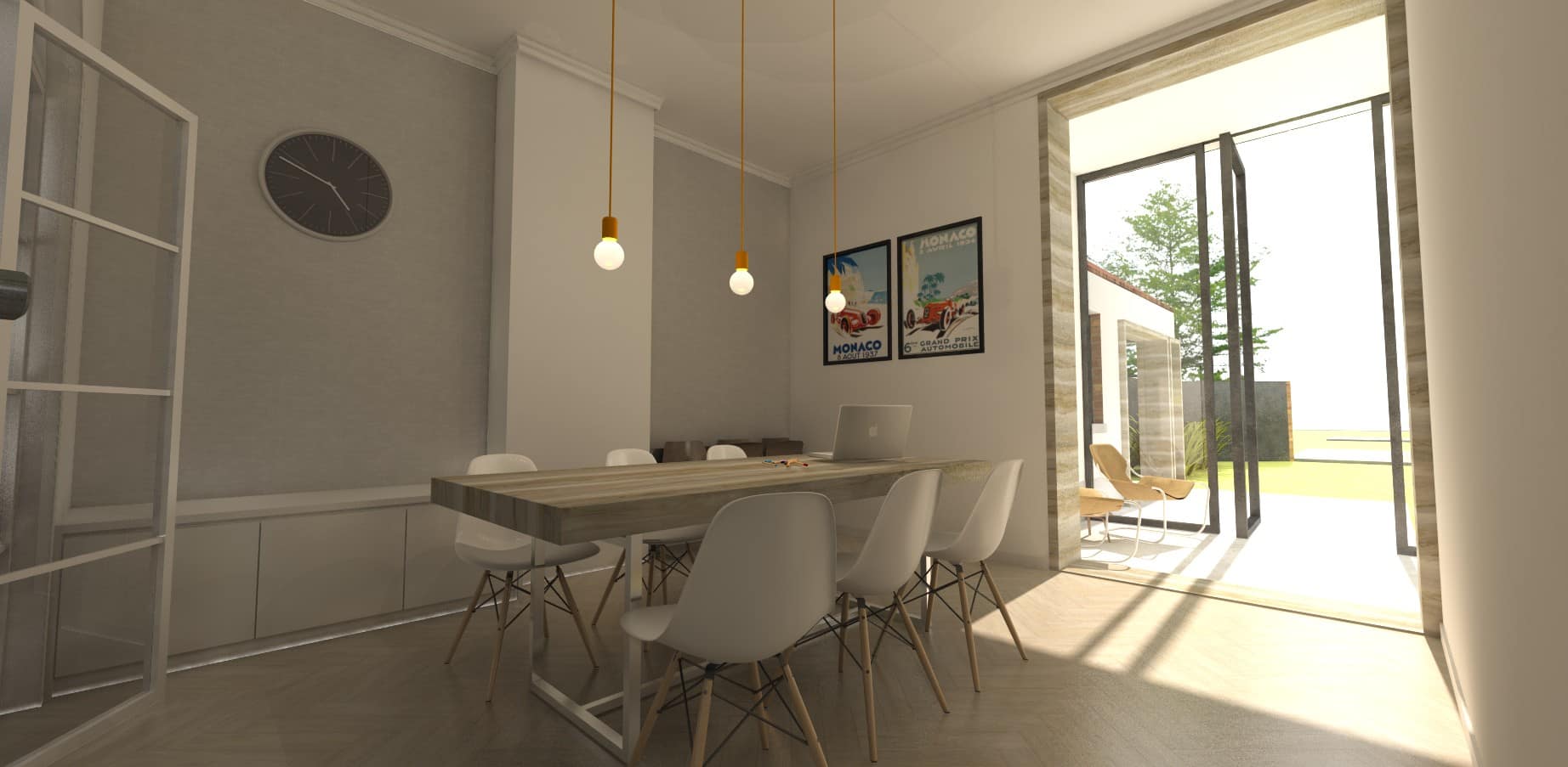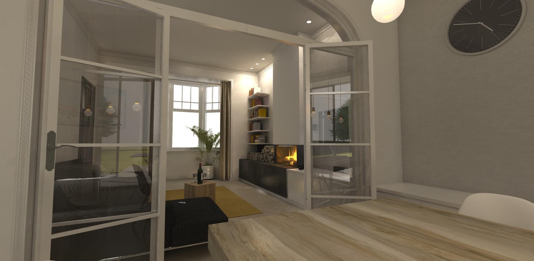 De grote, hoge ramen zorgen zo voor een zonnige ruimte, die door het open zetten van de raampartijen de grens tussen binnen & buiten volledig doen vervagen…