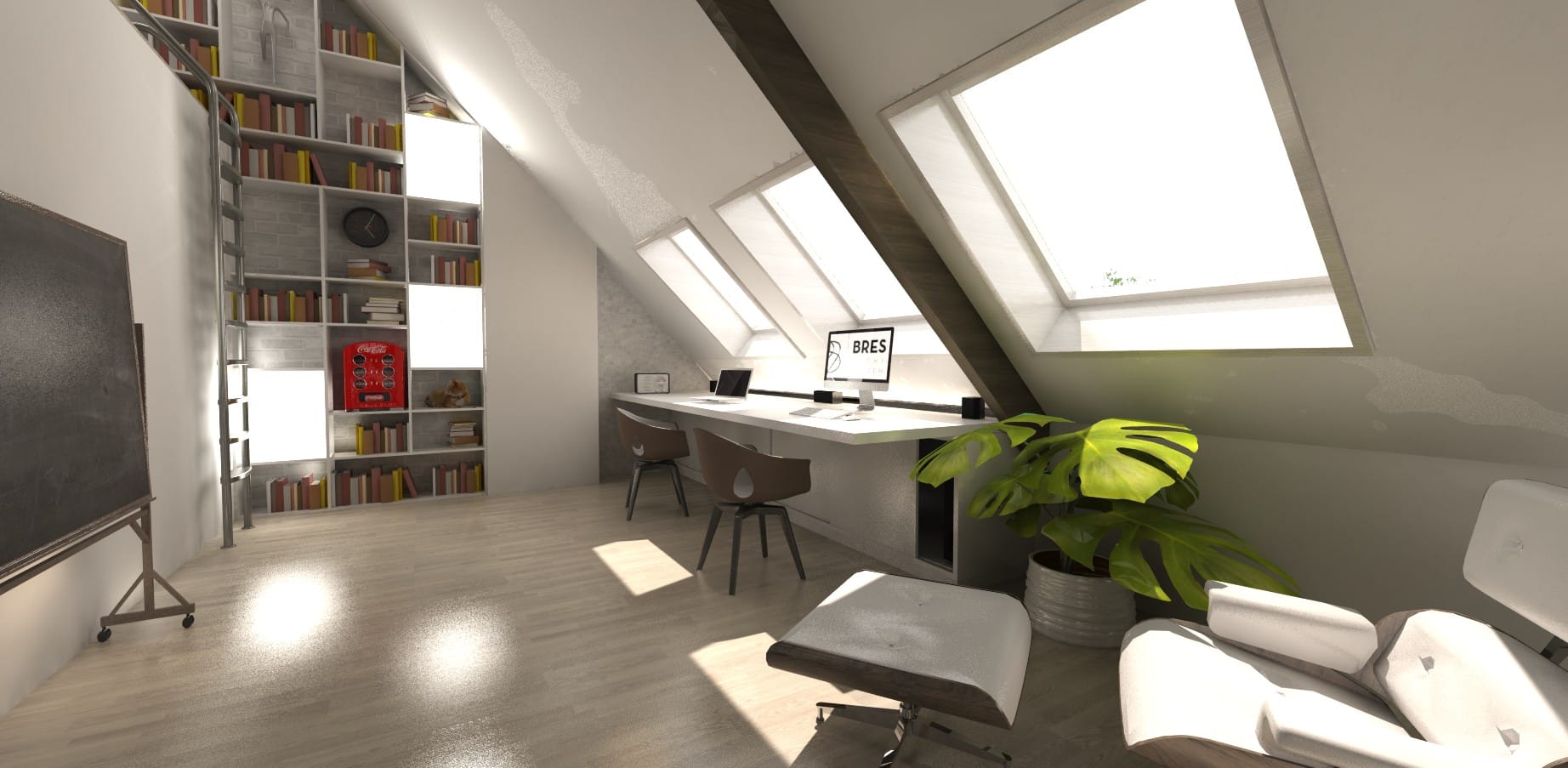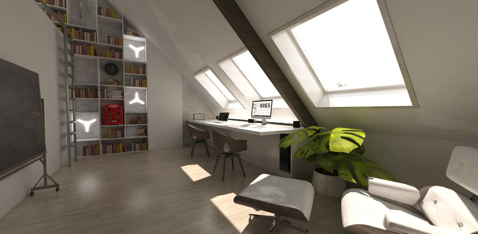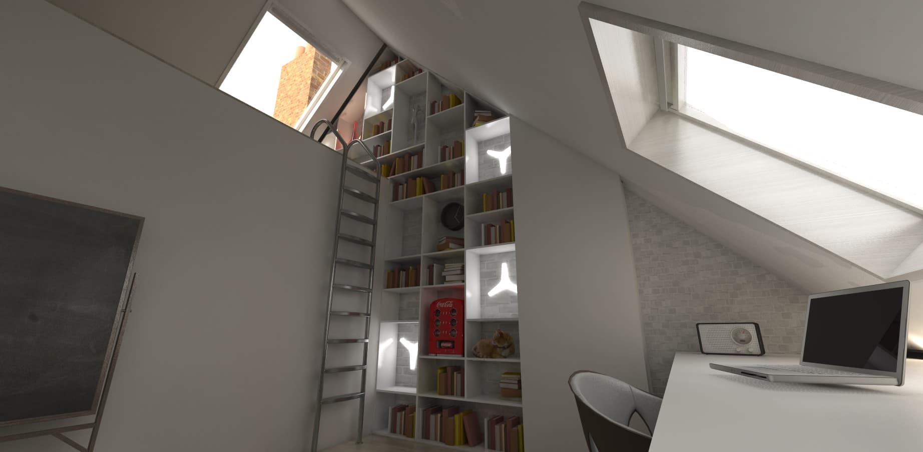 Helemaal boven in de woning is nog een ganse zolderruimte beschikbaar. Na het vernieuwen van het dak, en het isoleren & afwerken van de binnendakvlakken, krijgt deze zolder de nieuwe functie van hobbykamer. Enkele tactisch geplaatste dakvlakramen zorgen voor een optimale lichtinval op het brede bureaublad, die vlak naast de hoge boekenkast een ideale onderdakse werkplek biedt aan de bewoners…