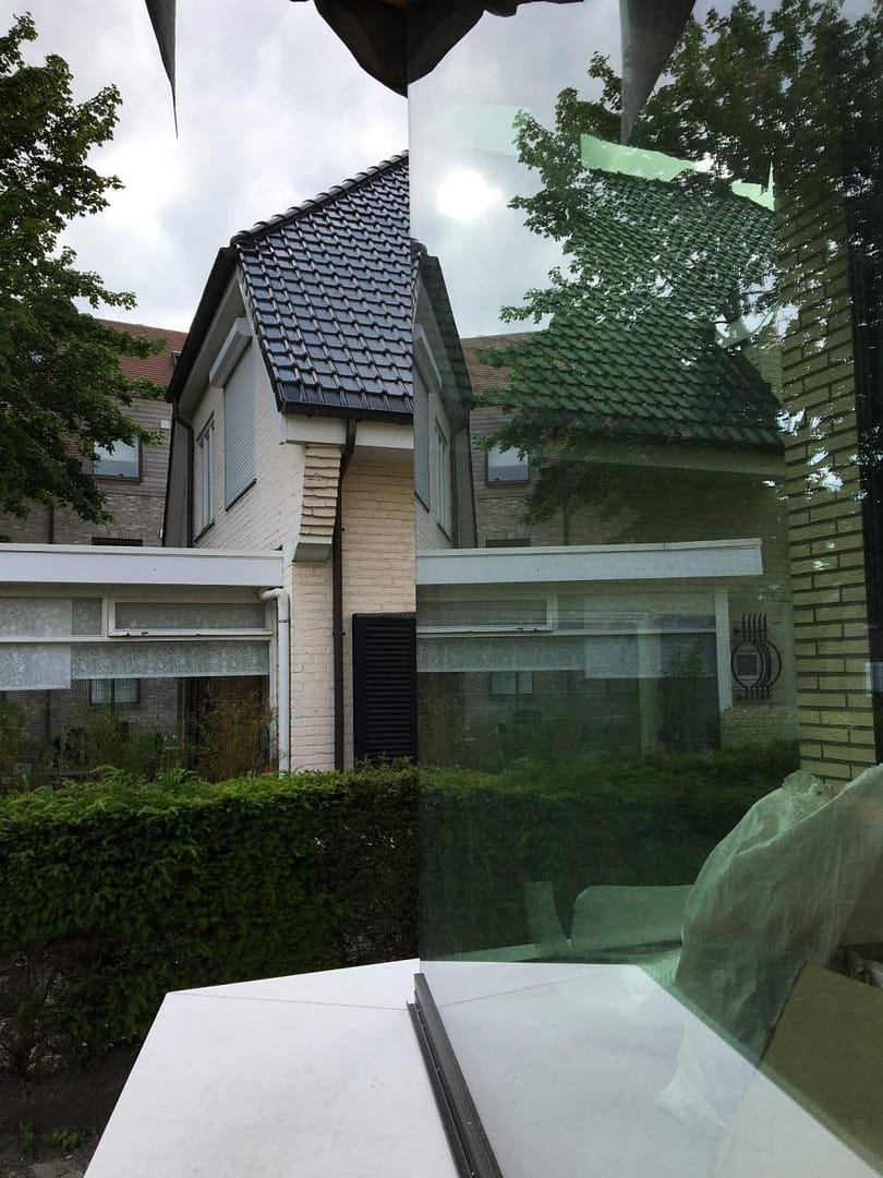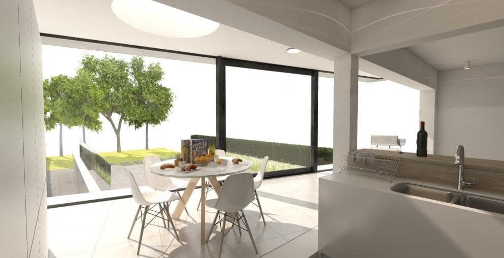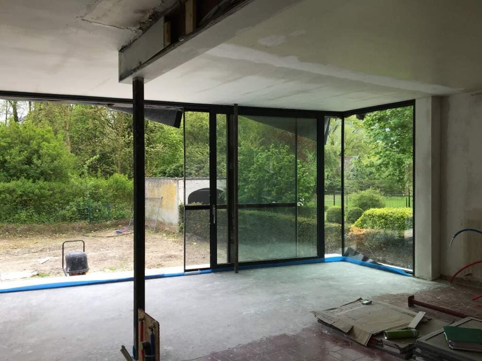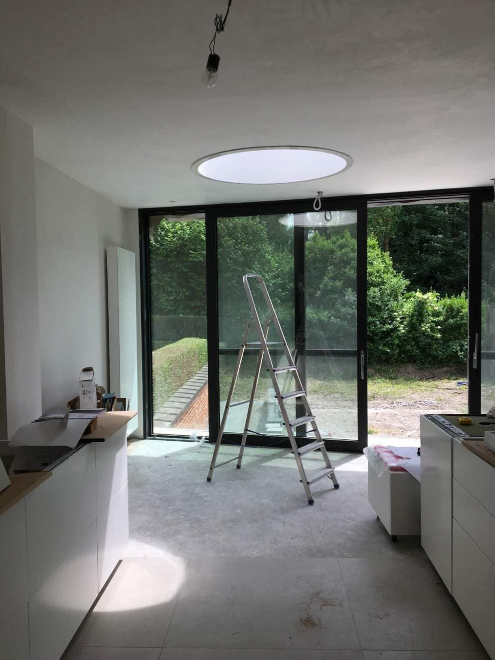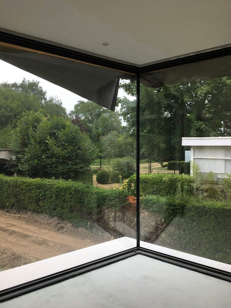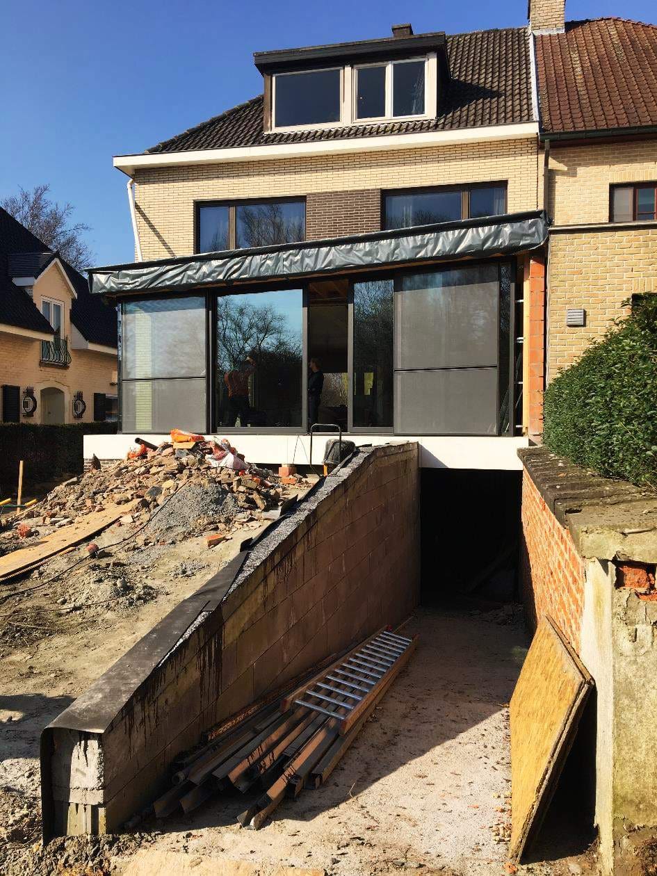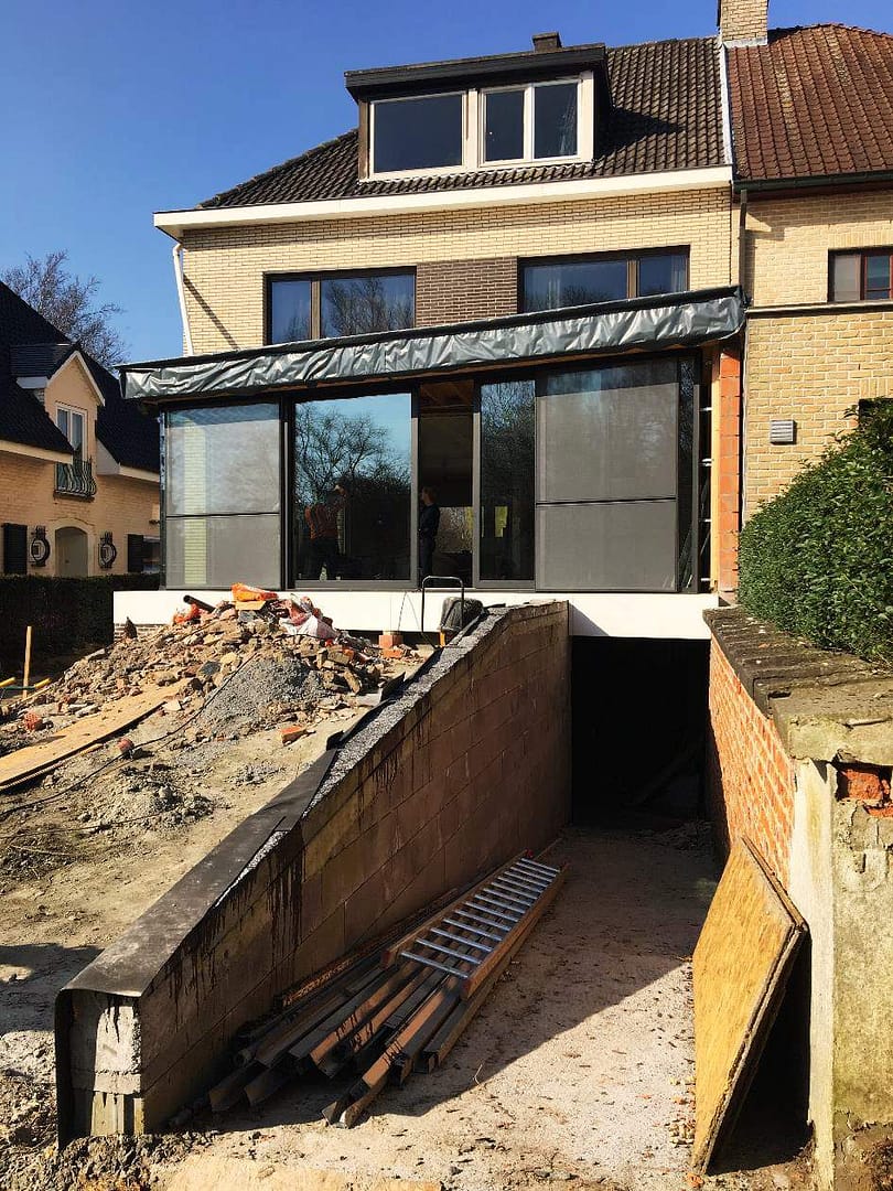 De betonnen helling richting kelder wordt gereduceerd tot een smallere helling van een kleine twee meter breedte, tegenaan de perceelgrens met de linkerbuur. Een glazen balustrade zorgt voor de valbeveiliging zonder visuele hinder.