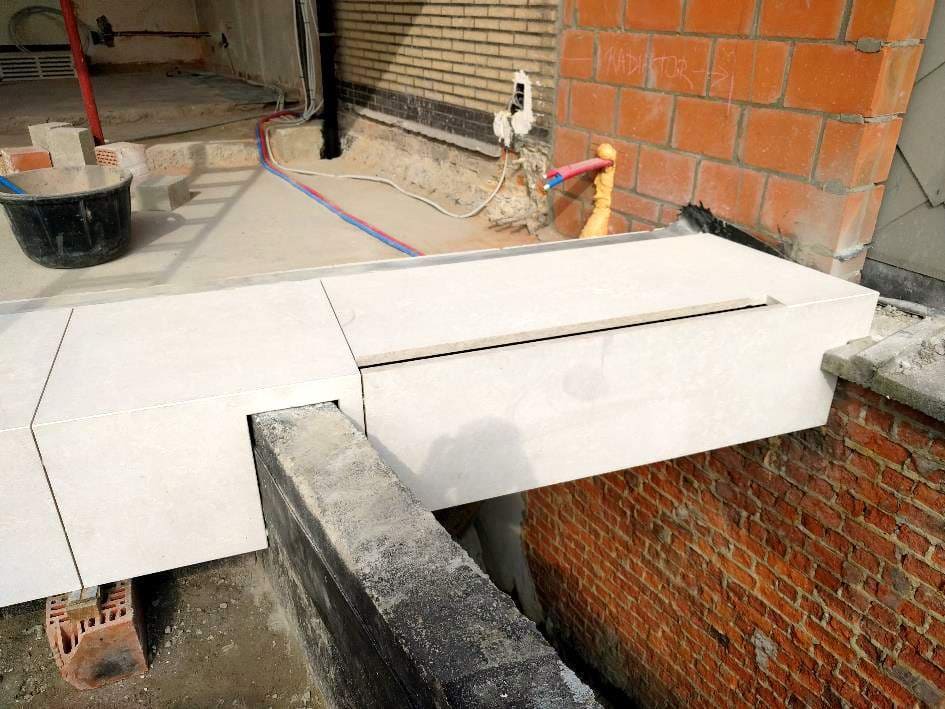 Om de achteruitbouw zijn typische U-vorm te geven (geheel van sokkel, zijgevel rechts en dakrand), gingen we op zoek naar een mooie, egaal witte natuursteen. Voor de buitentrappen, het terras en de bekleding van de betonnen keerwand werd gekozen voor een graniet die wat contrast geeft met de witte natuursteen.