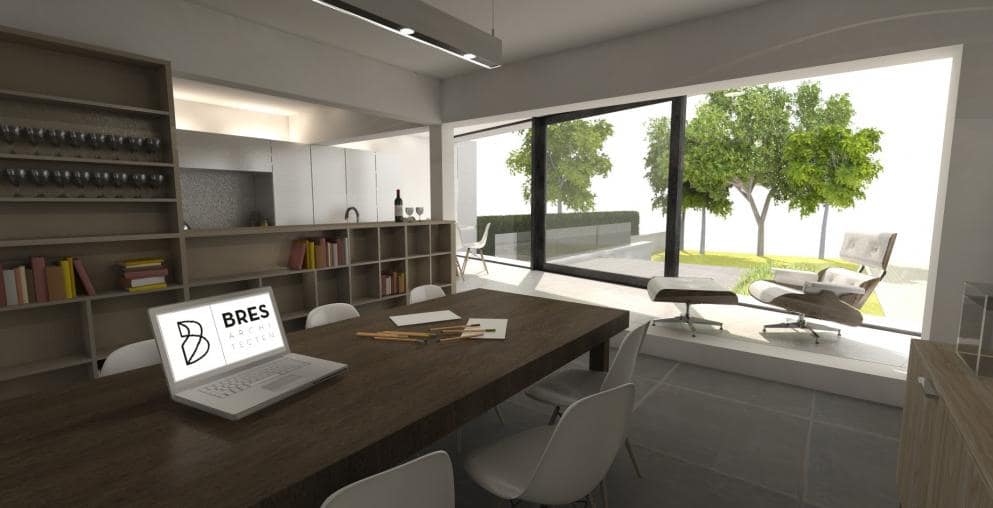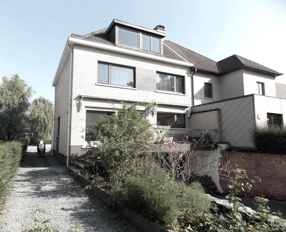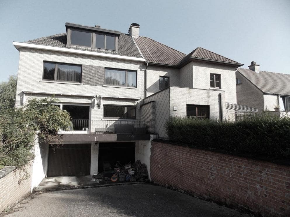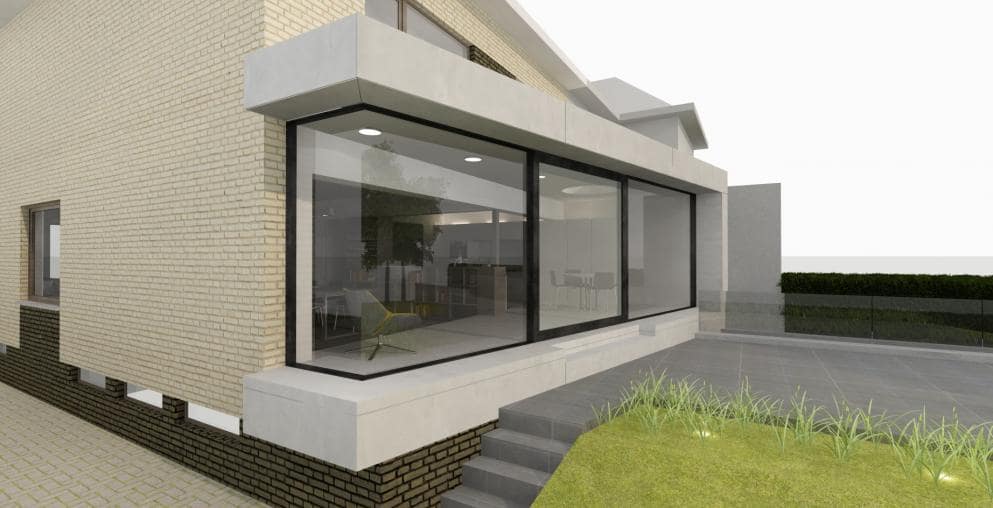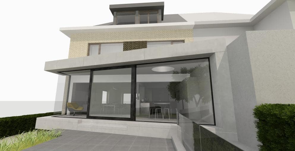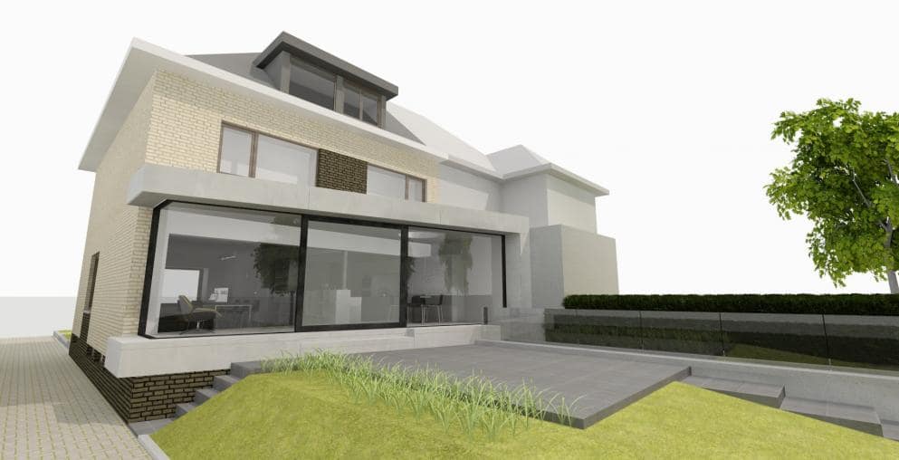 Een blik op de bestaande achtergevel waarop de huidige obstakels zich duidelijk manifesteren: een hoogteverschil tussen het terras en de oprit, een tuin die haast volledig bestaat uit een betonnen helling,… kortom: een situatie die niet langer strookt met het zorgeloos grootbrengen van drie kinderen.