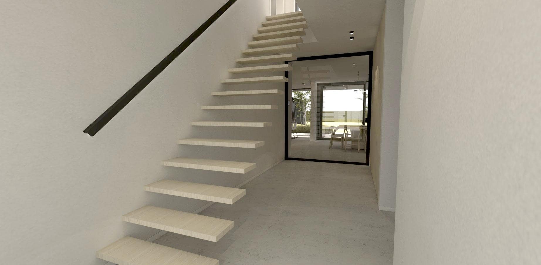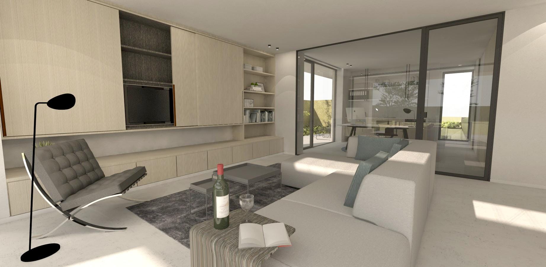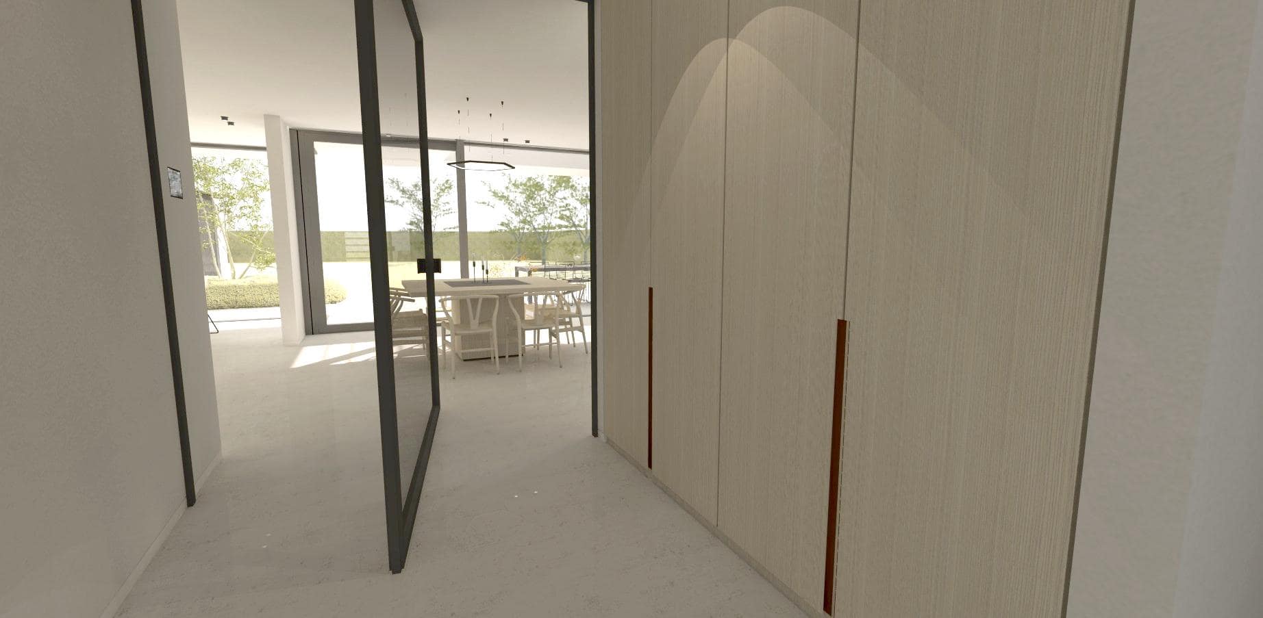 De organisatie van het gelijkvloers zit logisch in elkaar en sluit een teveel aan circulatie maximaal uit. In het midden vooraan steekt de inkomhal die toegang biedt aan het bezoekerstoilet, de bureau, de trap naar de verdieping en tot slot de leefruimte. De bewoners zullen wellicht vaker kiezen voor de ‘achterdeur’ vooraan de woning onder de carport, die onzichtbaar is ingewerkt in de aluminium gevelbekleding. Via die deur komen we in de berging/wasplaats en vervolgens in de open keuken. Het gelijkvloers is een aaneenschakeling van maximaal opengewerkte ruimtes die naadloos in elkaar overvloeien zonder dat onmogelijk wordt gemaakt om deze afzonderlijk te gaan gebruiken. Binnendeuren zijn tot een minimum beperkt en als deze er zijn, gaat het om vloer-plafondhoge pivoterende panelen, al dan niet beglaasd.
