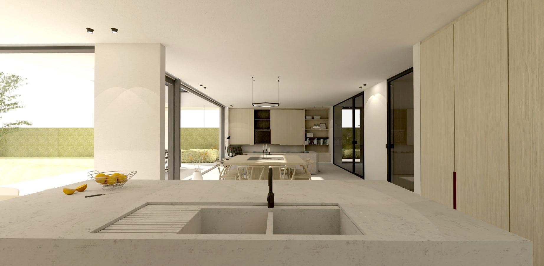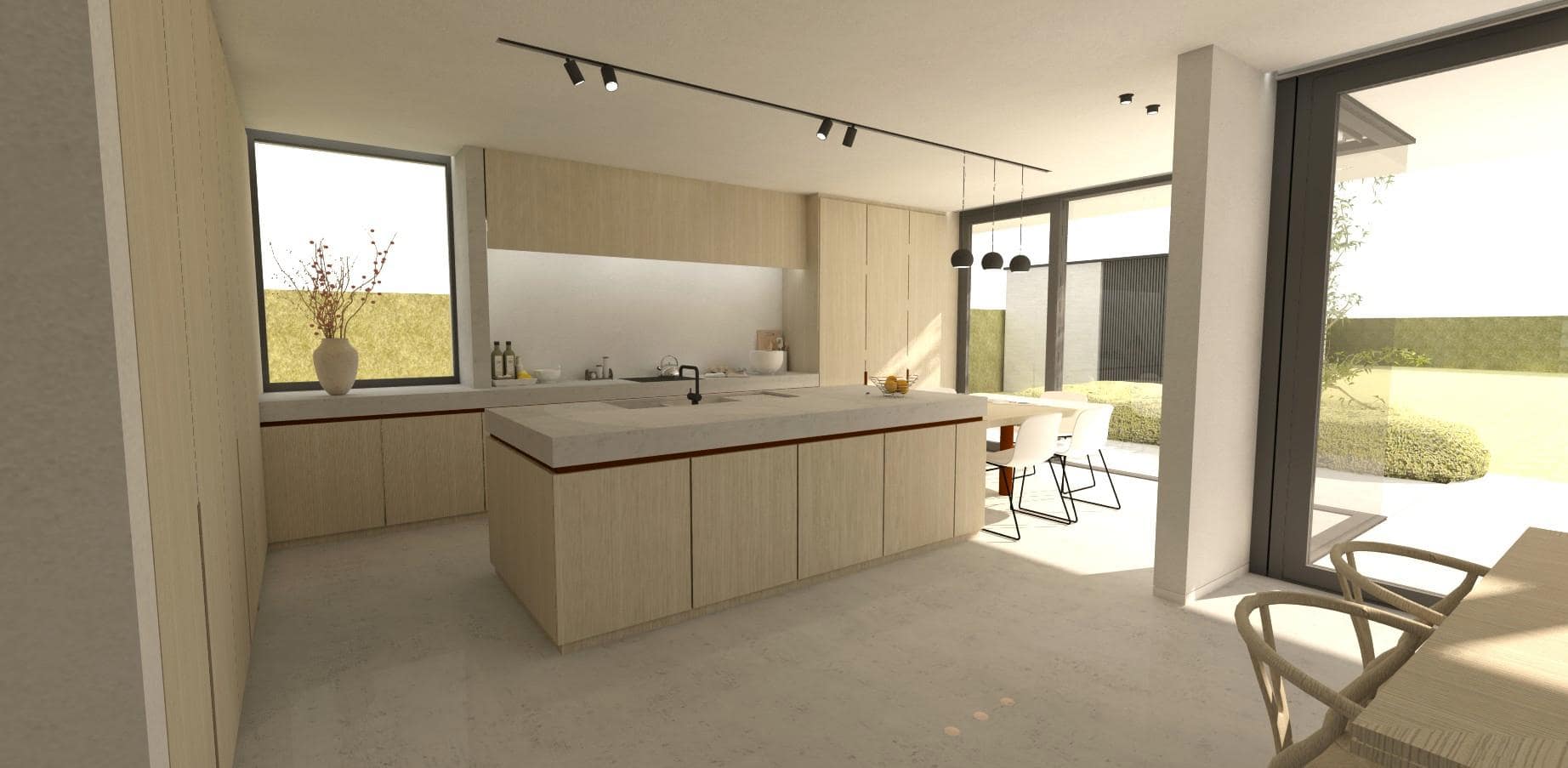 De open keuken links achteraan bereiken we via de berging/wasplaats, doorheen een verborgen doorloopkas. De open keuken is in de lengte gearticuleerd, parallel met de linker zijgevel, waarin een venster op het Oosten steekt om maximaal de ochtendzon te capteren. We koken in het midden van een lang en diep werkblad, geflankeerd door voldoende kolomkasten om alles in kwijt te kunnen. In het midden van de keuken staat een eiland met gootsteen. Wie daar aan het werk is geniet van een panorama op de tuin én heeft een aangename relatie met de rest van de leefruimte. In het verlengde van het eiland staat een ontbijttafel, nét wat om het hoekje t.o.v. de leefruimte om wat geborgenheid te bieden. Vanaf deze ontbijttafel waan je jezelf al op het terras, gezien de verbinding glas-glas op de buitenhoek van de achtergevel.