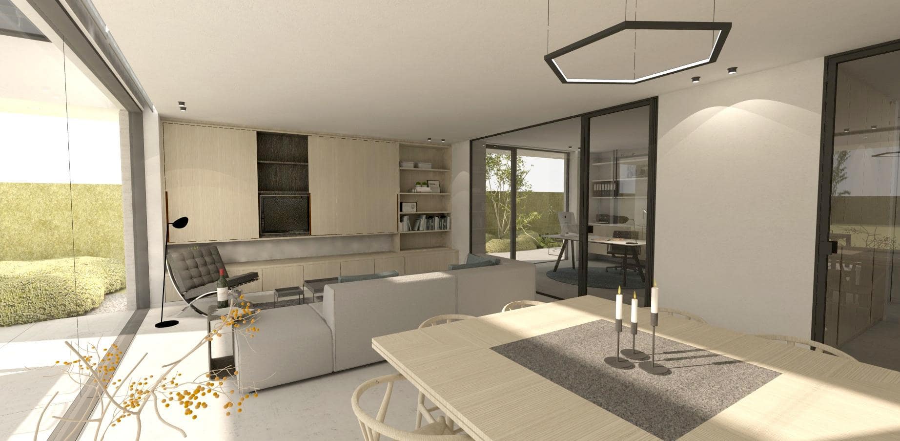 De leefruimte bevindt zich achteraan, en ontwikkelt zich parallel met de achtergevel zodat zowel de eetplaats als de zitplaats evenredig kunnen profiteren van een maximaal zicht op de diepe achtertuin. De eetplaats vormt een aangenaam middelpunt van waaruit enkele kijk-assen getrokken zijn: richting keuken en het venster op het oosten, doorheen de inkomhal en voordeur naar de oprit, doorheen de bureau en de badkamer naar de voortuin, en gezien de achtergevel integraal beglaasd is, heeft men een royaal zicht op de mooie achtertuin.