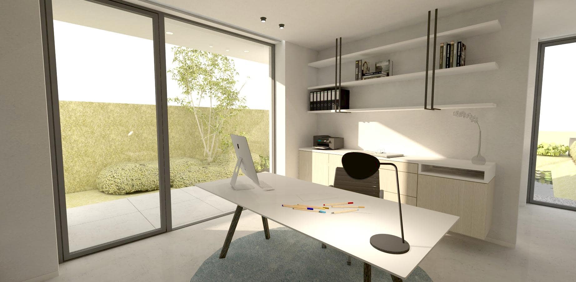 De zitplaats en de bureau zijn aan elkaar gelinkt dmv beglaasd binnenschrijnwerk, maar kunnen perfect afzonderlijk worden gebruikt. En dat is geen overbodige luxe wanneer de bureau ooit plaats zal maken voor een slaapkamer op het gelijkvloers. Aanpalend aan de bureau/slaapkamer is nog een gelijkvloerse badkamer voorzien met wastafel en ruime inloopdouche.