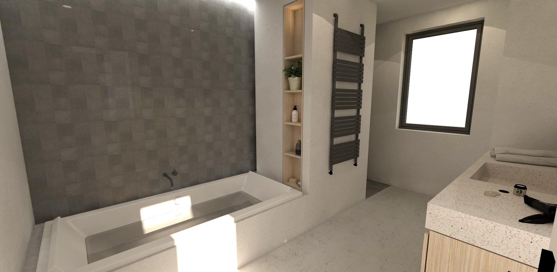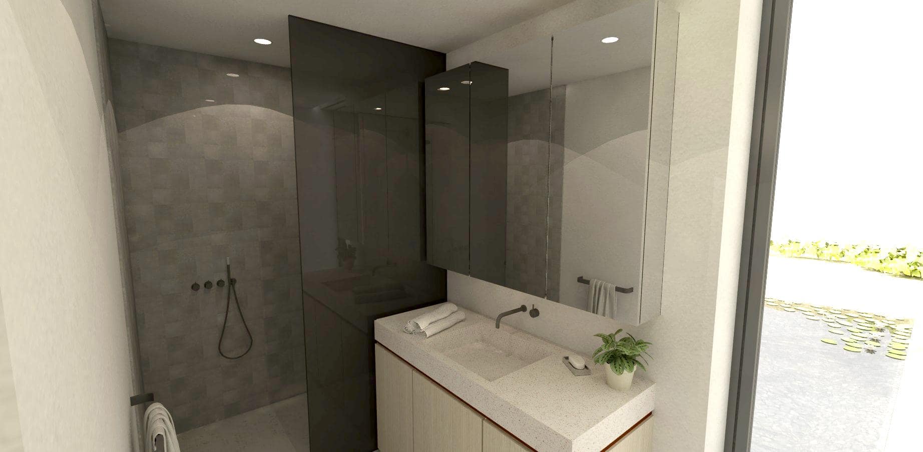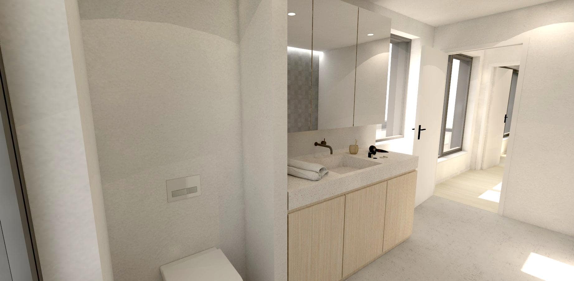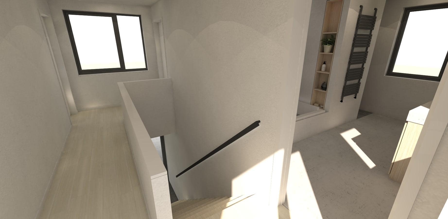 De verdieping meet slechts de helft van het gelijkvloers, doordat we hebben gekozen voor een compacte schikking van de drie slaapkamers en een badkamer rondom de centrale nachthal. De badkamer vinden we meteen bij het boven komen, links. De badkamer heeft een venster op het Oosten en het Westen, voor zowel ochtendlicht als avondlicht. De badkamer is voorzien van een ligbad en een ruime inloopdouche die onzichtbaar is weggewerkt in een nis. Hetzelfde geldt voor het toilet, dat evenzeer wat verborgen zit op het einde van de badkamer, achter de wastafel. Recht tegenover de badkamer vinden we de master bedroom, eveneens thv de achtergevel. Op die manier kijken de bewoners vanuit hun bed op de achtertuin en op het groendak boven de gelijkvloerse leefruimte.