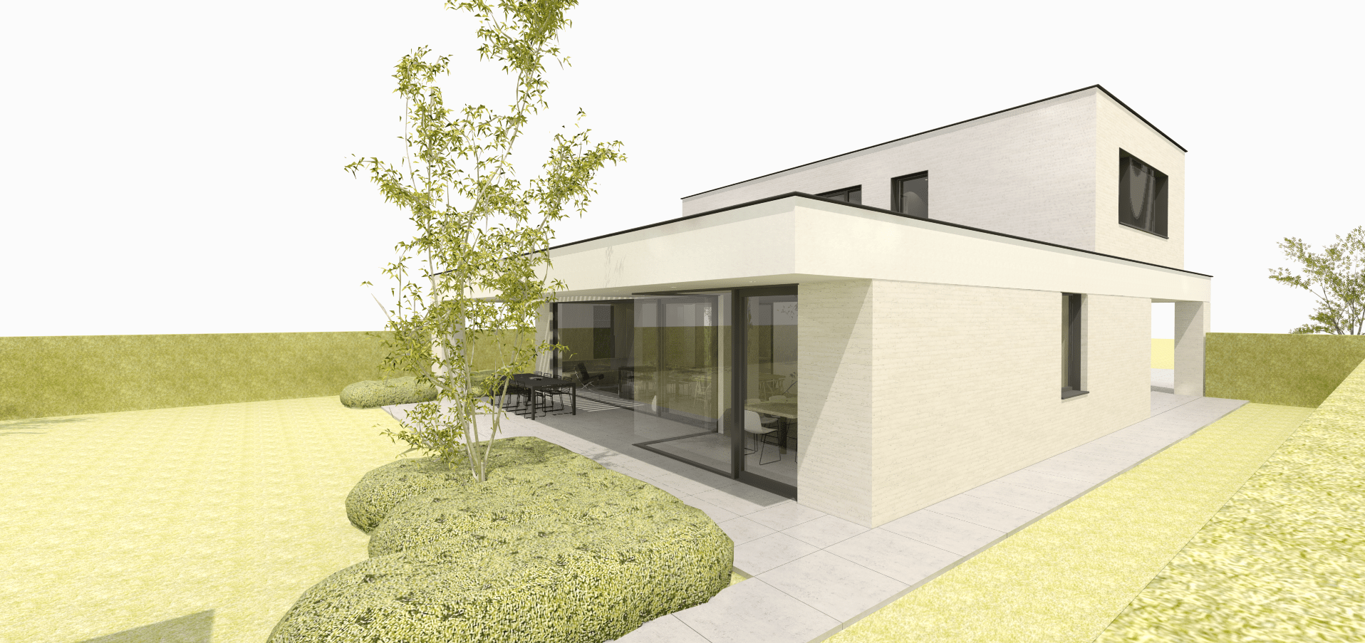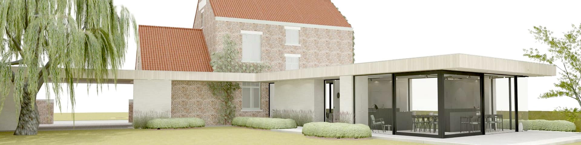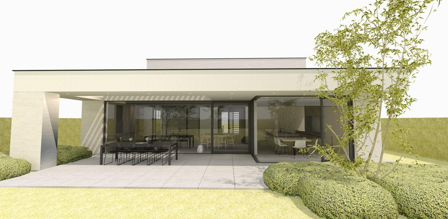 We maken gebruik van een dakoversteek thv de achtergevel van de gelijkvloerse verdieping om de beglaasde achtergevel te beschermen tegen ongewenste zonnetoetreding. Net voorbij de leefruimte meet deze oversteek maar liefst 3m diep, waardoor een groot deel van het terras wordt overdekt. Handig meegenomen om maximaal van het terras gebruik te kunnen maken ondanks de wisselende weersomstandigheden. In deze diepe dakoversteek is een opening gemaakt, waarboven kantelbare én openschuivende aluminium lamellen komen te zitten. Aan de hand van deze installatie kunnen de bewoners kiezen voor een opengewerkte dakoversteek met maximale licht- en zonnewinst thv het terras en in de leefruimte of voor het andere uiterste: een volledig gesloten dakoversteek waardoor het gehele terras in de schaduw komt te zitten en droog blijft tijdens regenbuien.