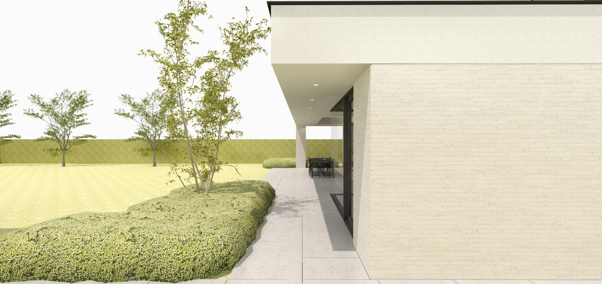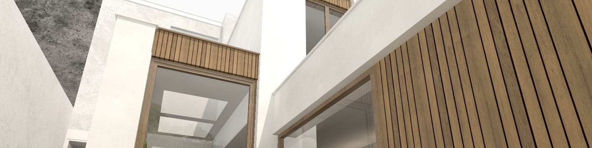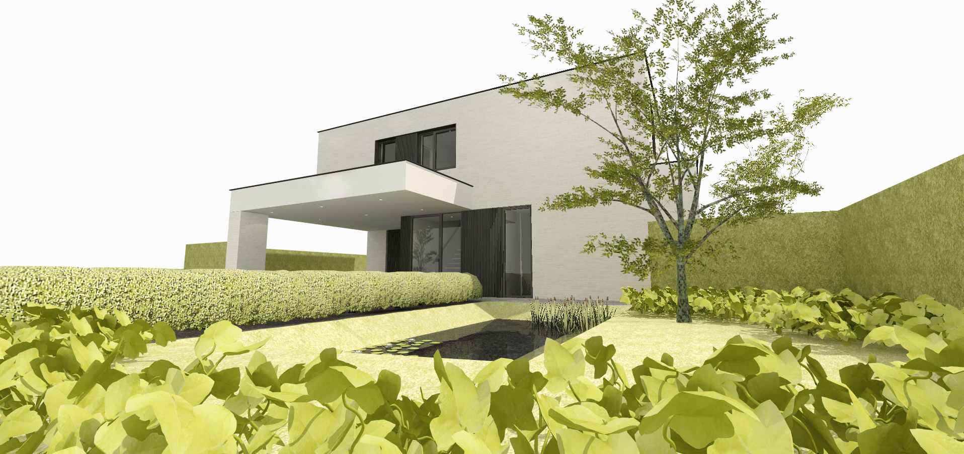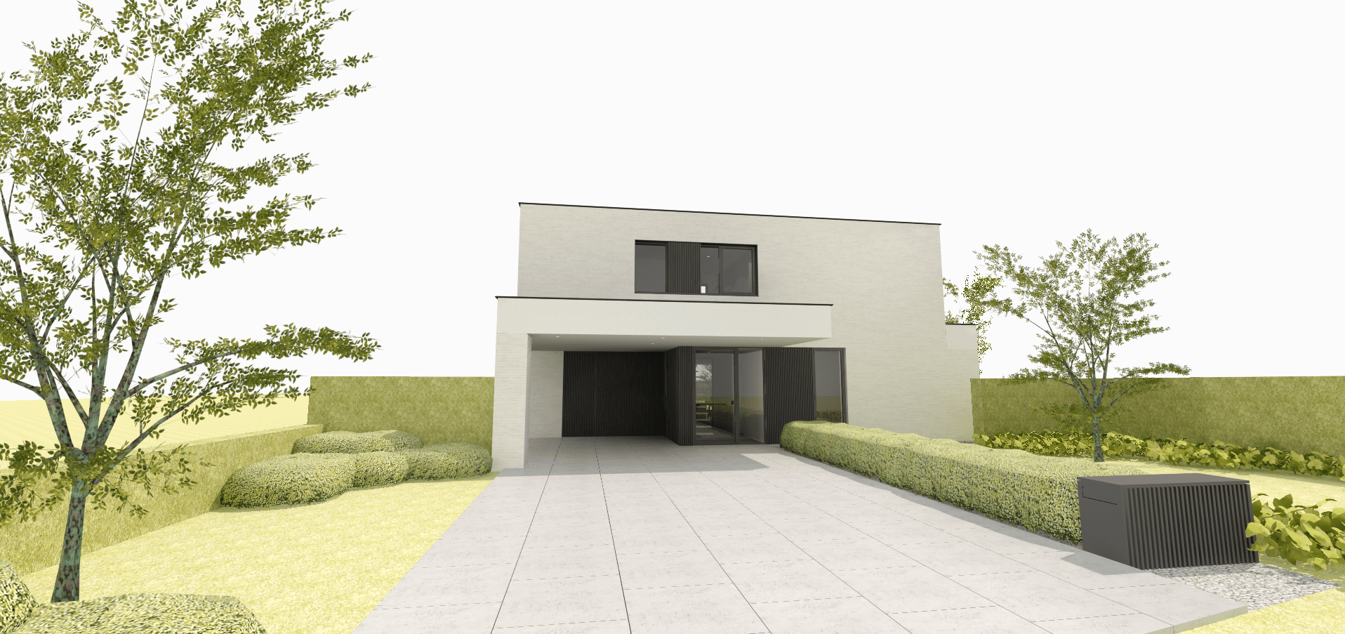 We maken gebruik van een dakoversteek thv de achtergevel van de gelijkvloerse verdieping om de beglaasde achtergevel te beschermen tegen ongewenste zonnetoetreding. Net voorbij de leefruimte meet deze oversteek maar liefst 3m diep, waardoor een groot deel van het terras wordt overdekt. Handig meegenomen om maximaal van het terras gebruik te kunnen maken ondanks de wisselende weersomstandigheden. In deze diepe dakoversteek is een opening gemaakt, waarboven kantelbare én openschuivende aluminium lamellen komen te zitten. Aan de hand van deze installatie kunnen de bewoners kiezen voor een opengewerkte dakoversteek met maximale licht- en zonnewinst thv het terras en in de leefruimte of voor het andere uiterste: een volledig gesloten dakoversteek waardoor het gehele terras in de schaduw komt te zitten en droog blijft tijdens regenbuien.