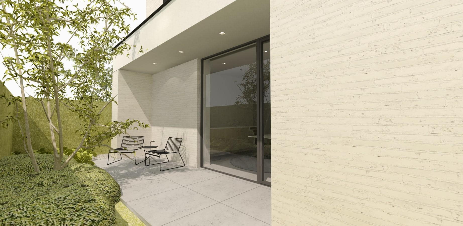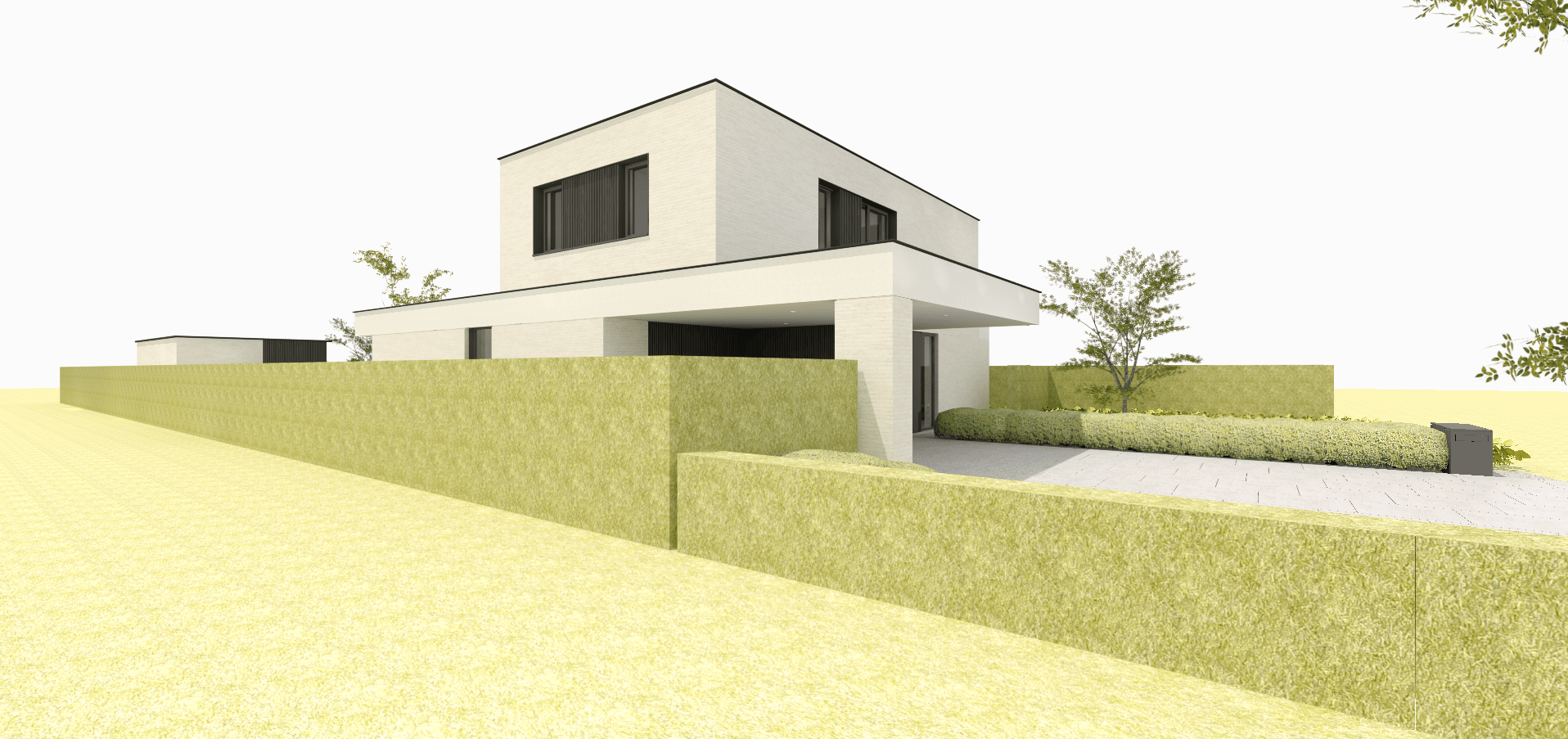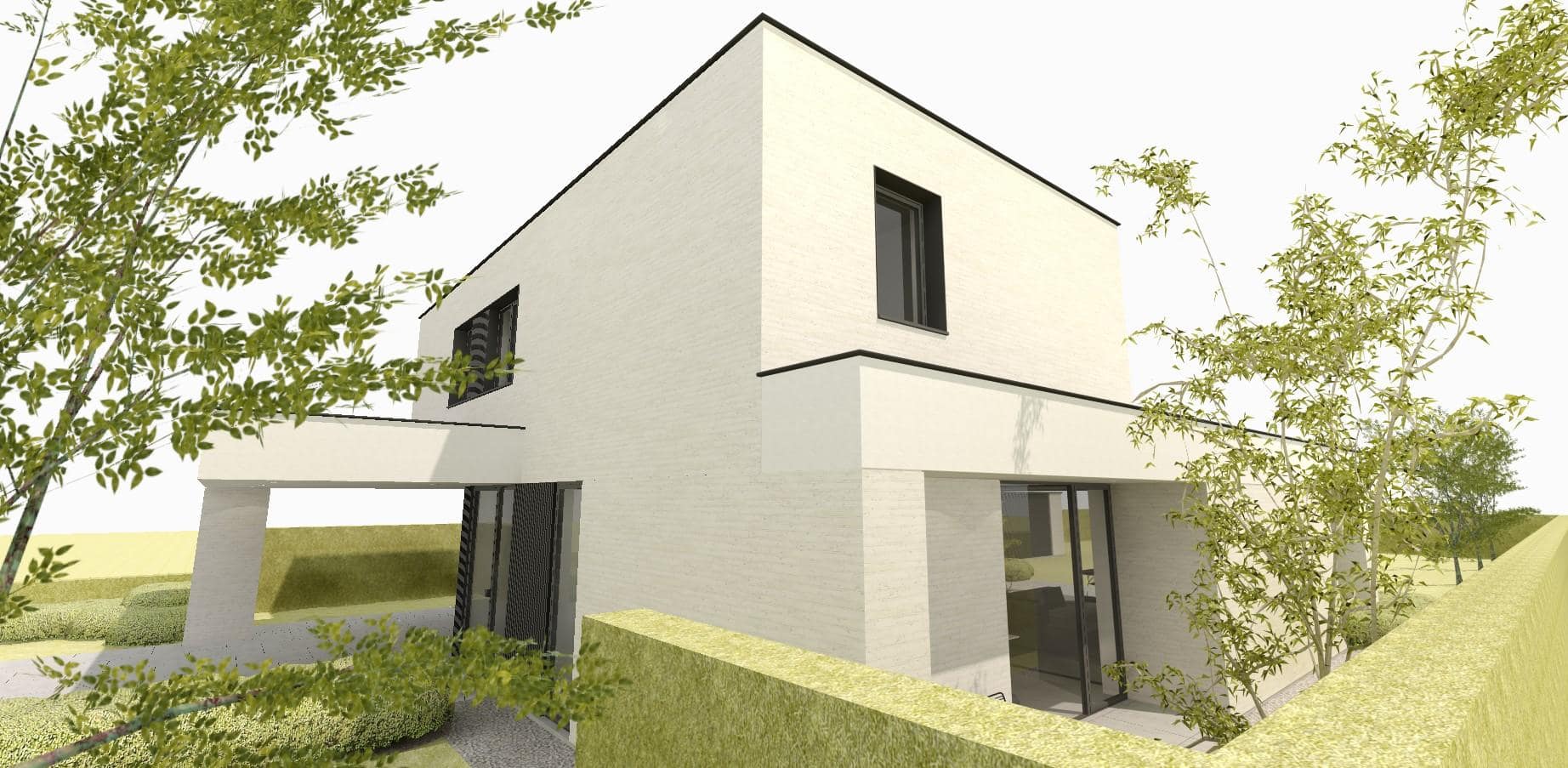 De woning is ontworpen in een sobere, tijdloze vormentaal. Hoewel vrij compact heeft ze niet het voorkomen van een blokkendoos, mede door de gearticuleerde dakrand van de dakoversteken van voor- en achtergevel, die ook t.h.v. de linker en de rechter zijgevel ononderbroken doorloopt. De vensteropeningen van het gelijkvloers zijn allen verdiepinghoog en reiken vanaf de vloerpas tot aan de onderzijde van de dakrand in sierpleister. Op die manier beogen we het effect dat deze dakrand wordt ondersteund door massieve delen in metselwerk, waarbij de vensters meer als openingen tussen interieur en exterieur worden ervaren, dan louter als een raam in een stuk gevel. Op de verdieping kiezen we voor eenzelfde gedachtegang, maar d.m.v. een andere werkwijze: we koppelen telkenmale twee raamgehelen binnen éénzelfde geaccentueerd kader. Het gevelmetselwerk in gebroken wit heeft een gekaleid uiterlijk en getuigt van wat nonchalant ogende imperfecties. De dakrand wordt uitgevoerd in een sierpleister met eenzelfde kleurtoon als het gevelmetselwerk, waardoor de nuance vooral wordt gelegd d.m.v. het verschil in materiaal, meer dan door een kleurverschil.
